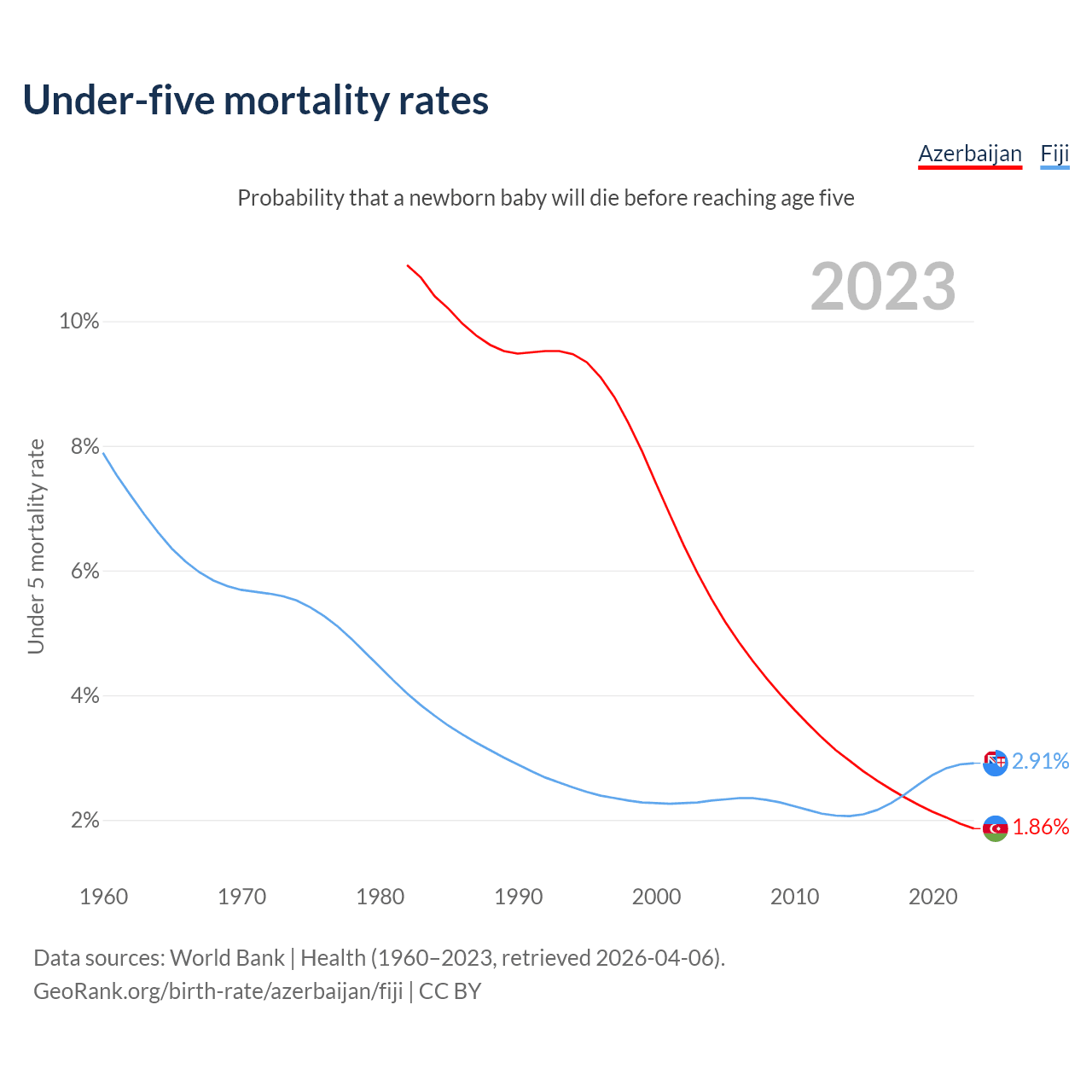 The chance that a newborn baby will die before reaching age five is 1.86% in Azerbaijan and 2.91% in Fiji. Above is a chart with historical data on under-five mortality rates.