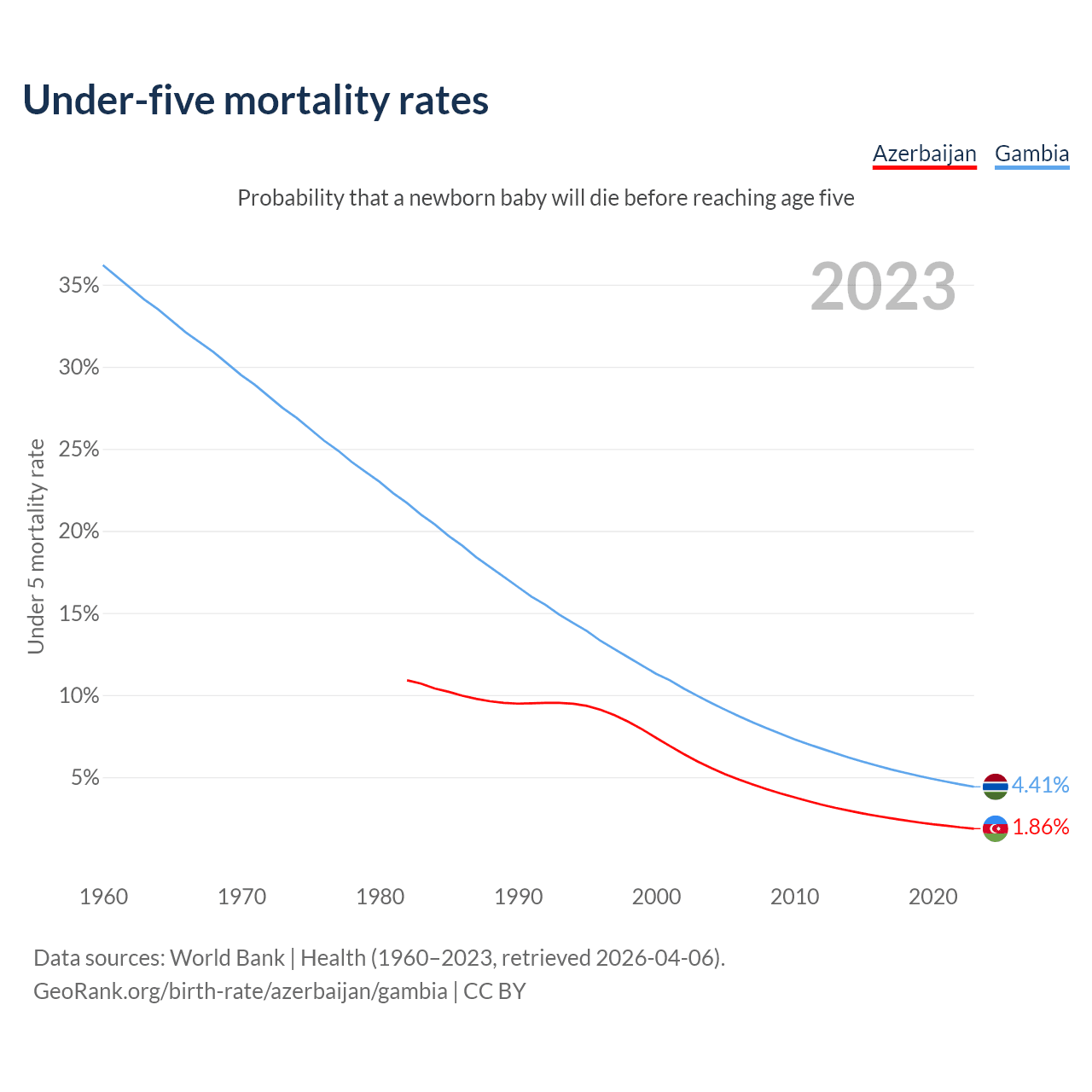 The chance that a newborn baby will die before reaching age five is 1.86% in Azerbaijan and 4.41% in the Gambia. Above is a chart with historical data on under-five mortality rates.