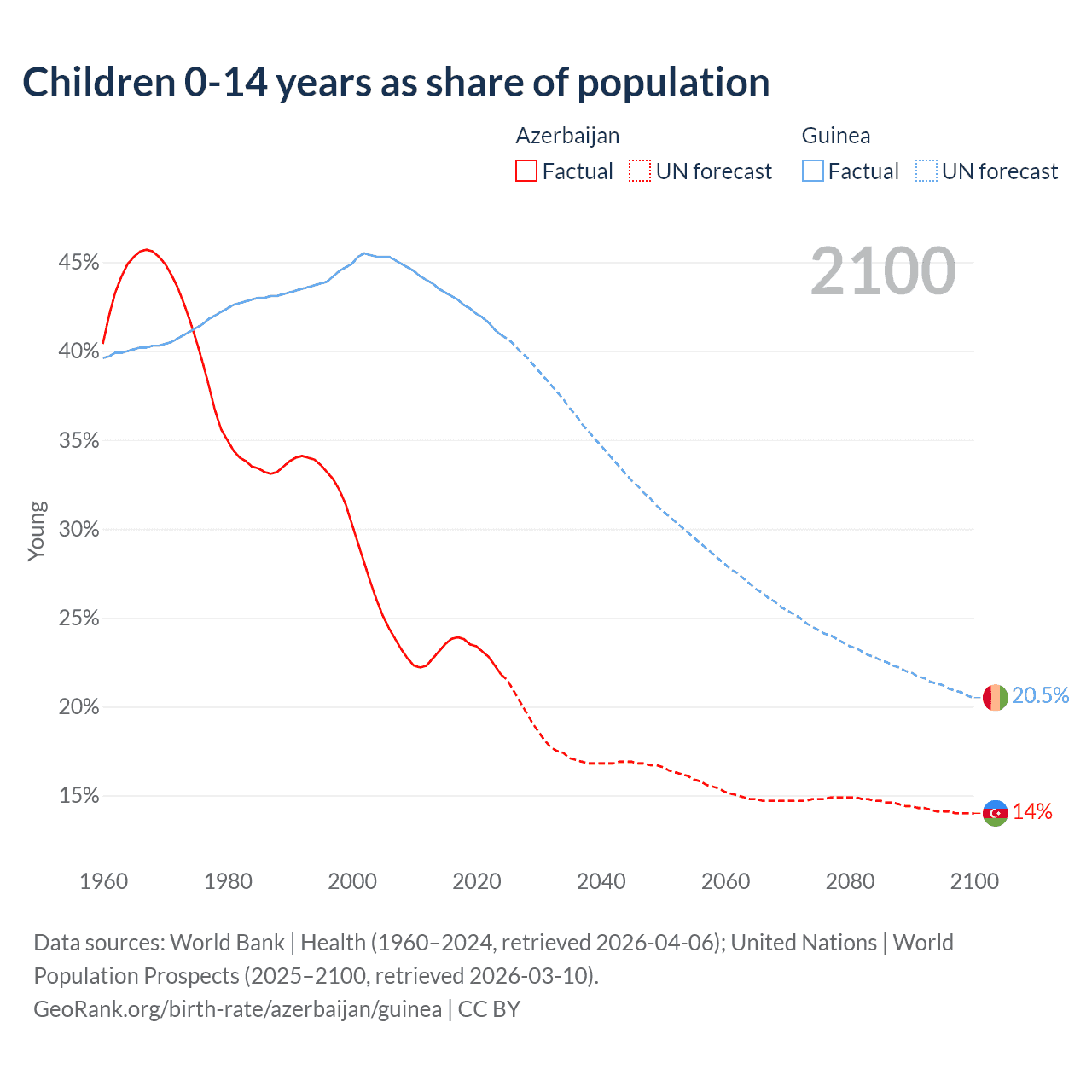 Azerbaijan has an annual birth rate of 11.1 births per 1,000 people, compared to 33.8 for Guinea. The average number of children a woman is expected to have during her lifetime — the fertility rate, is 1.55 in Azerbaijan and 4.22 in Guinea — 172.1% difference.