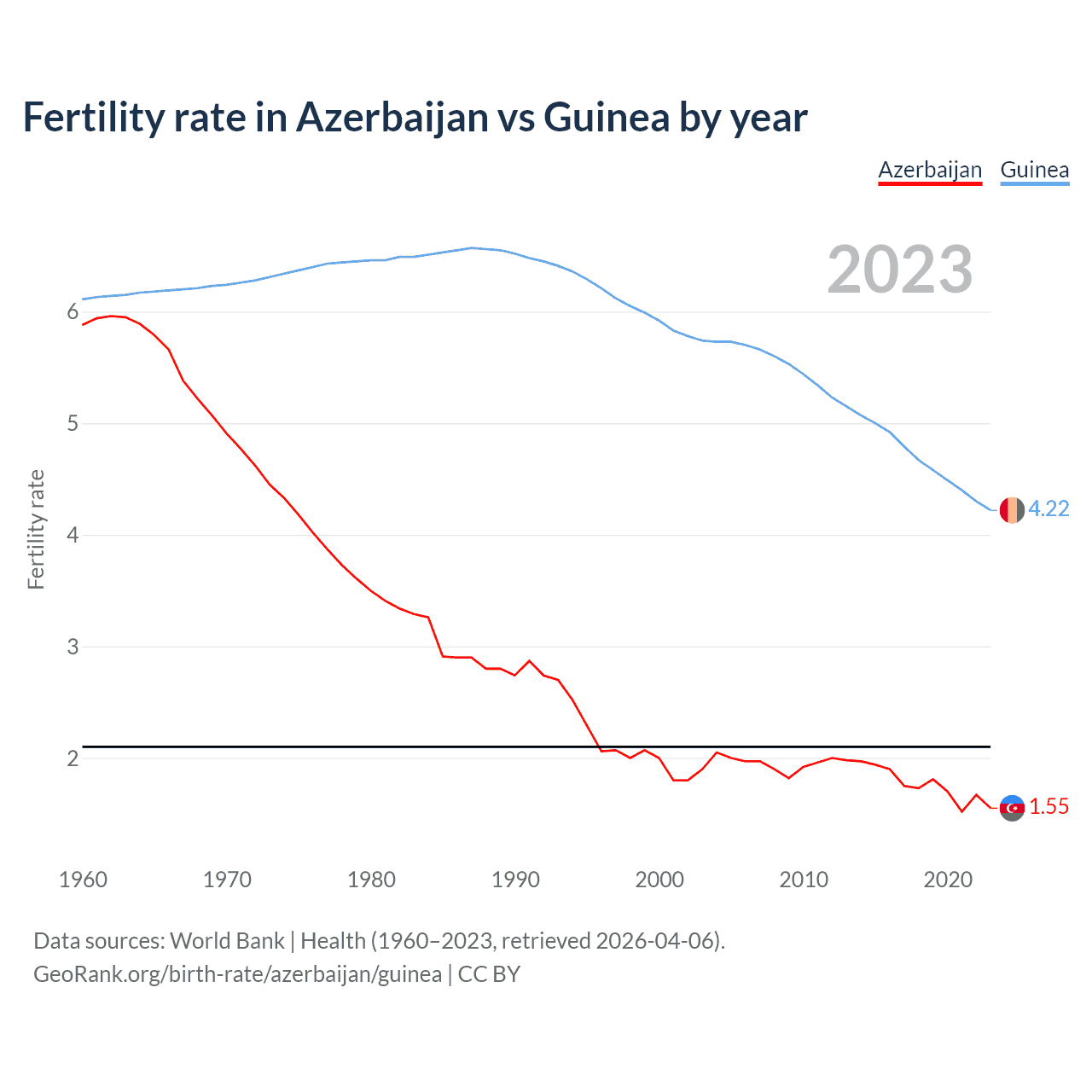 1960 vs 2023, the fertility rate has decreased by 73.6% in Azerbaijan and by 31% in Guinea — in 1960, it was 5.88 and 6.11, respectively.