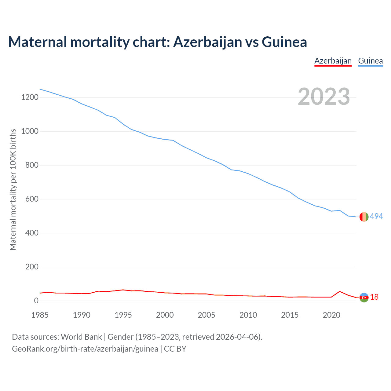 The maternal mortality rate, which is the probability of dying during childbirth or within 42 days of pregnancy termination, is 18 deaths per 100,000 live births in Azerbaijan, compared to 494 deaths in Guinea.