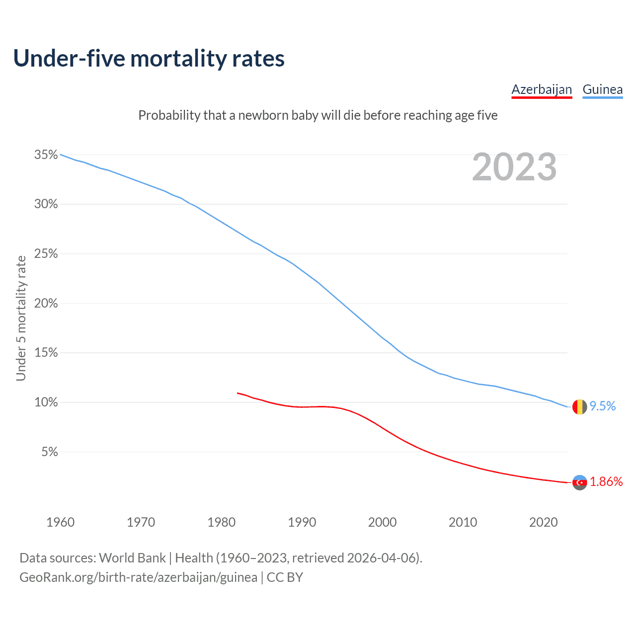 The chance that a newborn baby will die before reaching age five is 1.86% in Azerbaijan and 9.5% in Guinea. Above is a chart with historical data on under-five mortality rates.