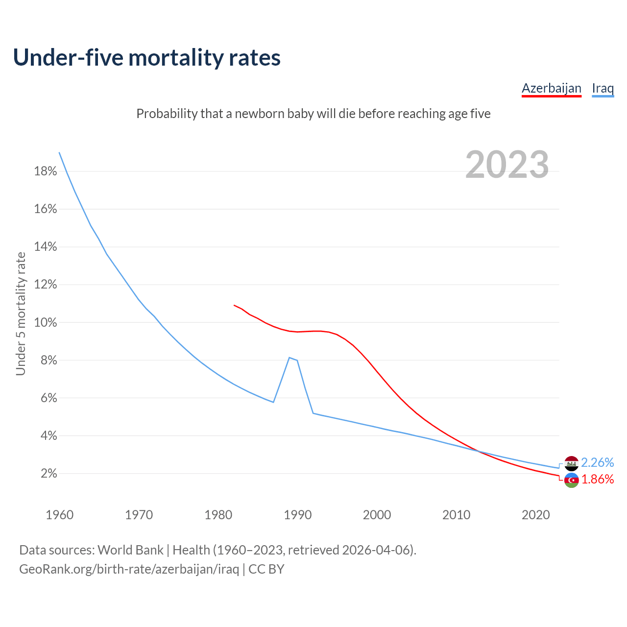 The chance that a newborn baby will die before reaching age five is 1.86% in Azerbaijan and 2.26% in Iraq. Above is a chart with historical data on under-five mortality rates.