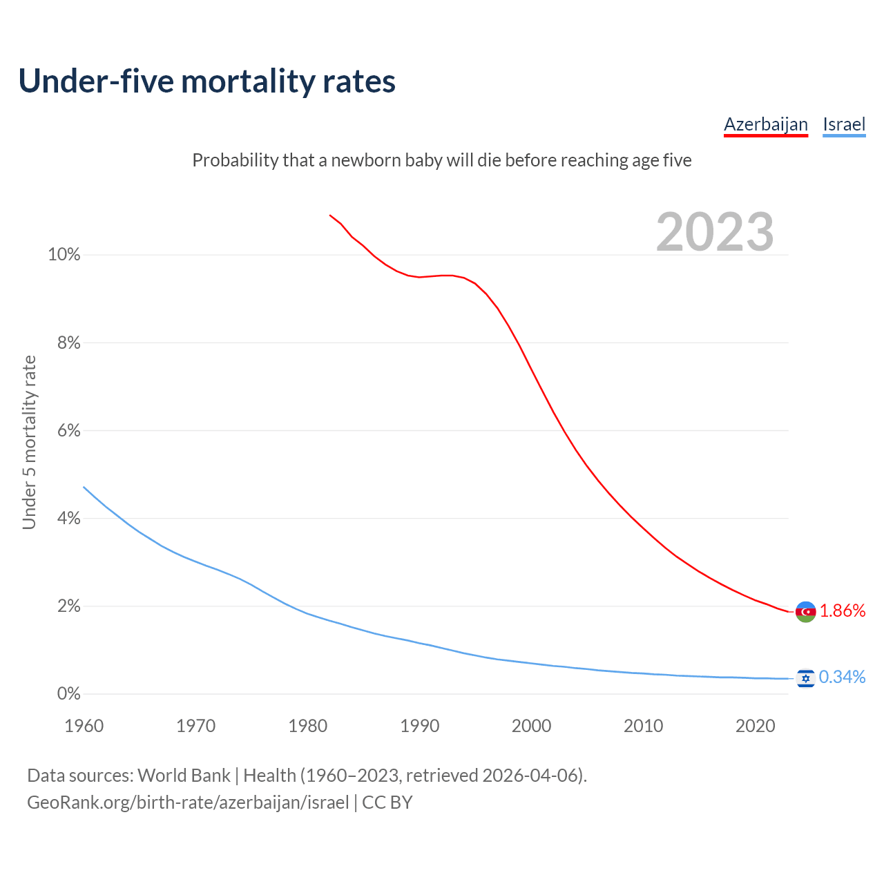 The chance that a newborn baby will die before reaching age five is 1.86% in Azerbaijan and 0.34% in Israel. Above is a chart with historical data on under-five mortality rates.
