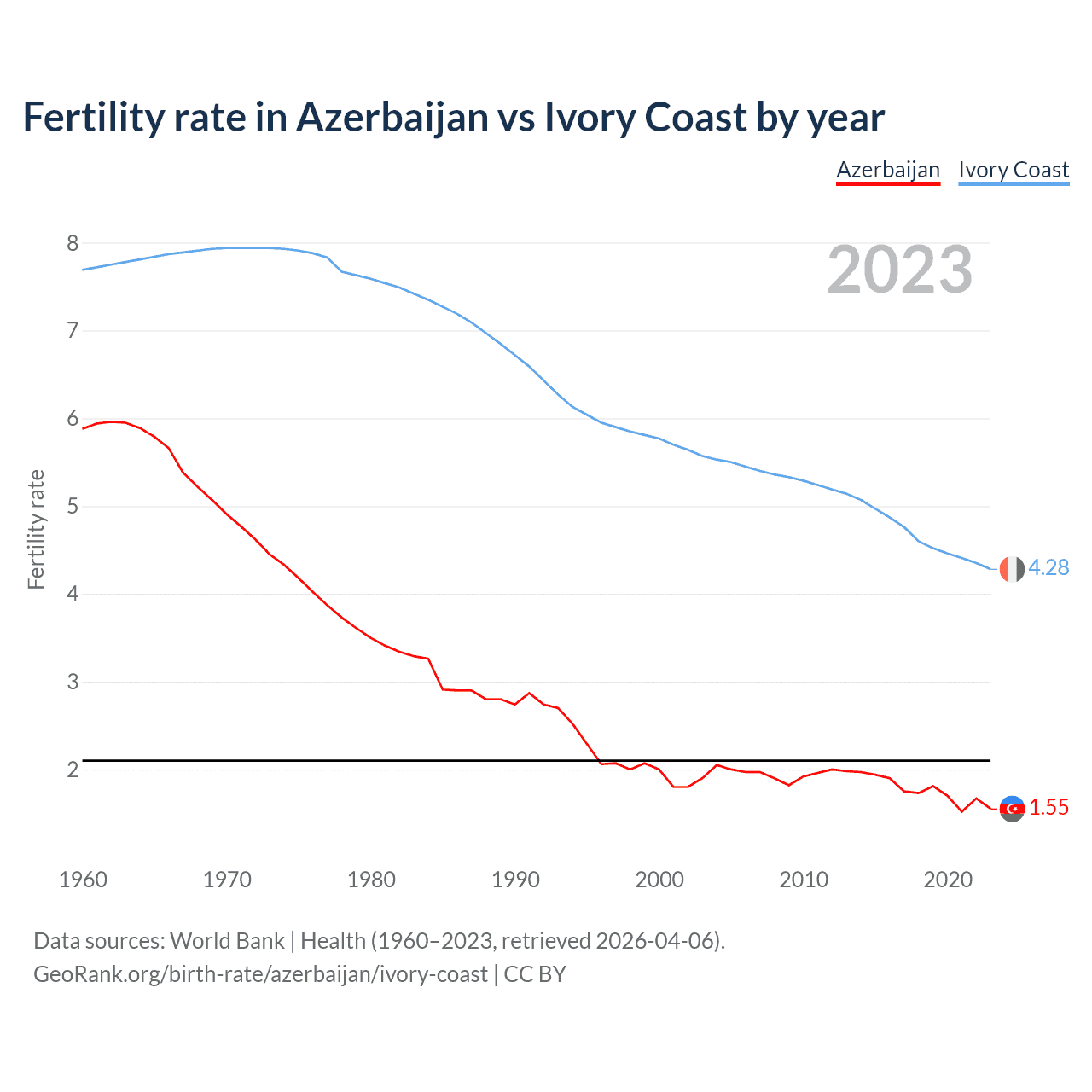 According to the latest available data on birth rates, the fertility rate in Azerbaijan was 1.55 children per woman in 2023, compared to 4.28 in Ivory Coast in 2023. The replacement level is considered to be 2.1 children per woman.