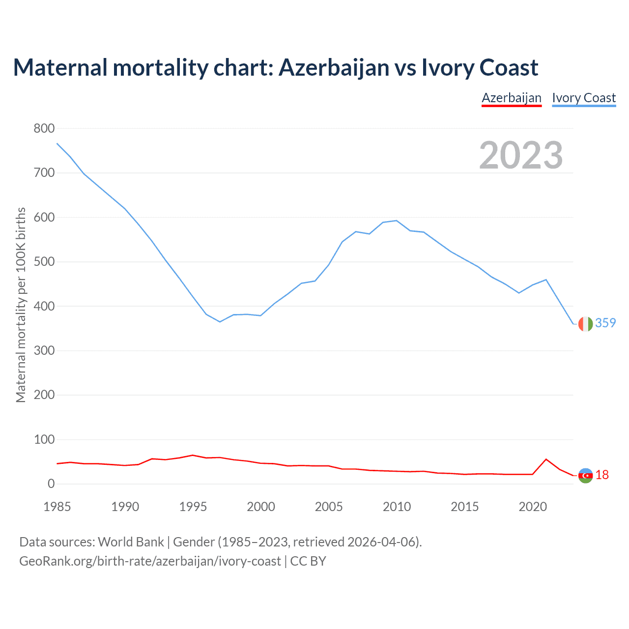 The maternal mortality rate, which is the probability of dying during childbirth or within 42 days of pregnancy termination, is 18 deaths per 100,000 live births in Azerbaijan, compared to 359 deaths in Ivory Coast.