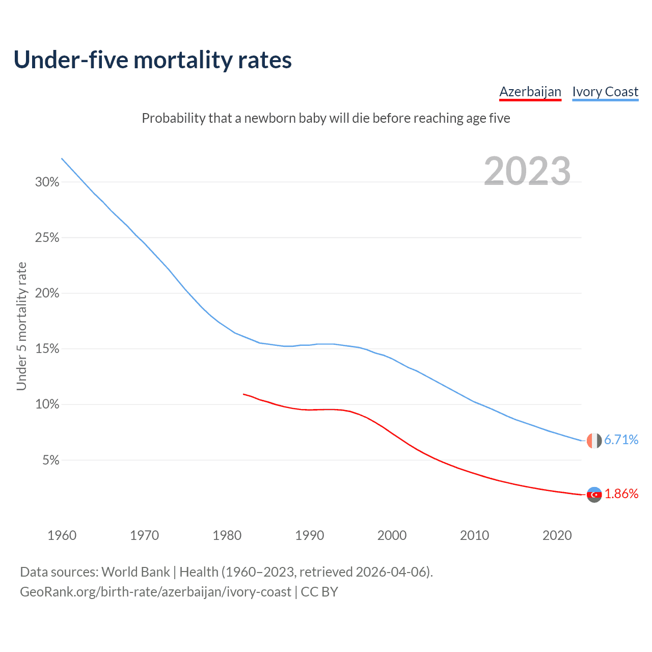 The chance that a newborn baby will die before reaching age five is 1.86% in Azerbaijan and 6.71% in Ivory Coast. Above is a chart with historical data on under-five mortality rates.