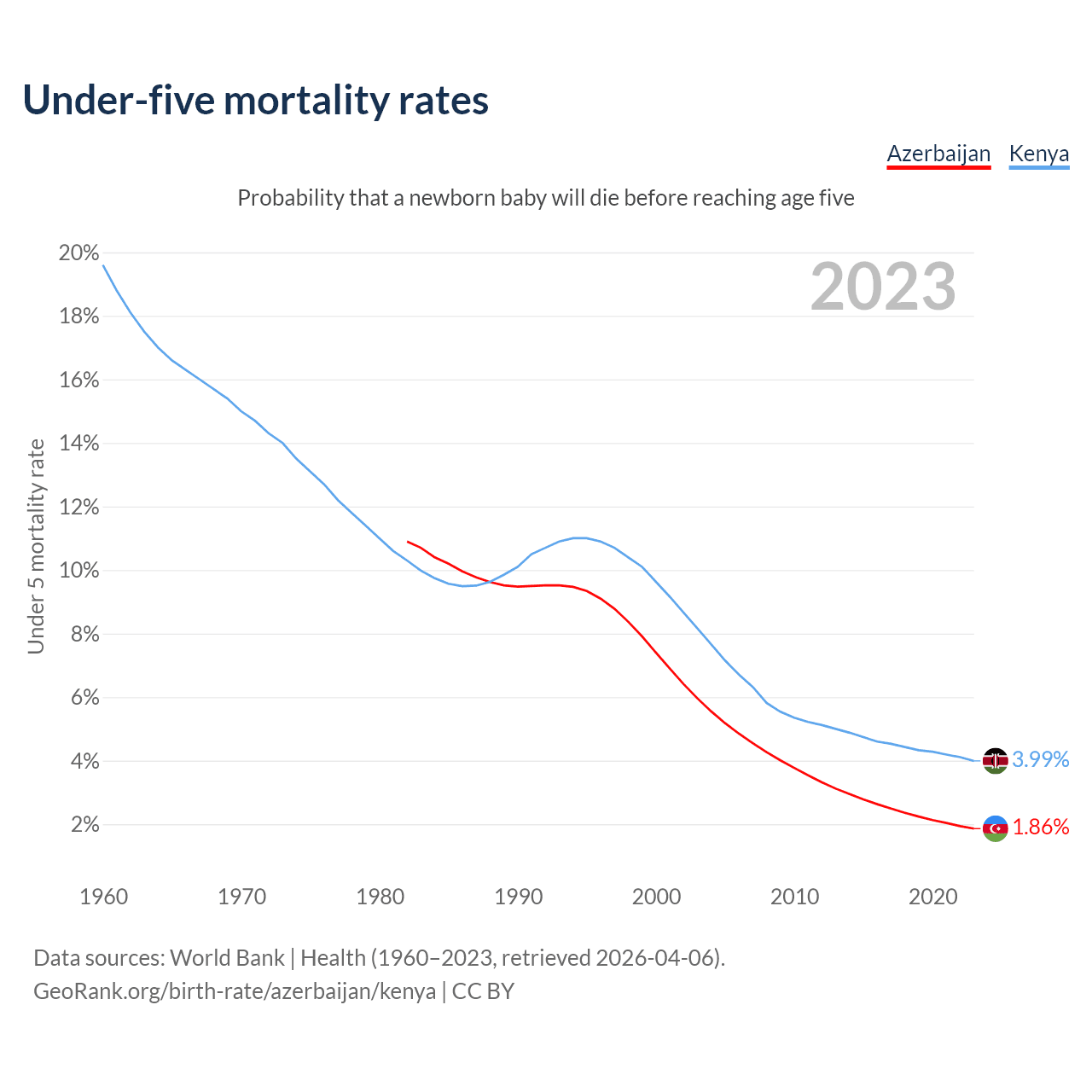 The chance that a newborn baby will die before reaching age five is 1.86% in Azerbaijan and 3.99% in Kenya. Above is a chart with historical data on under-five mortality rates.