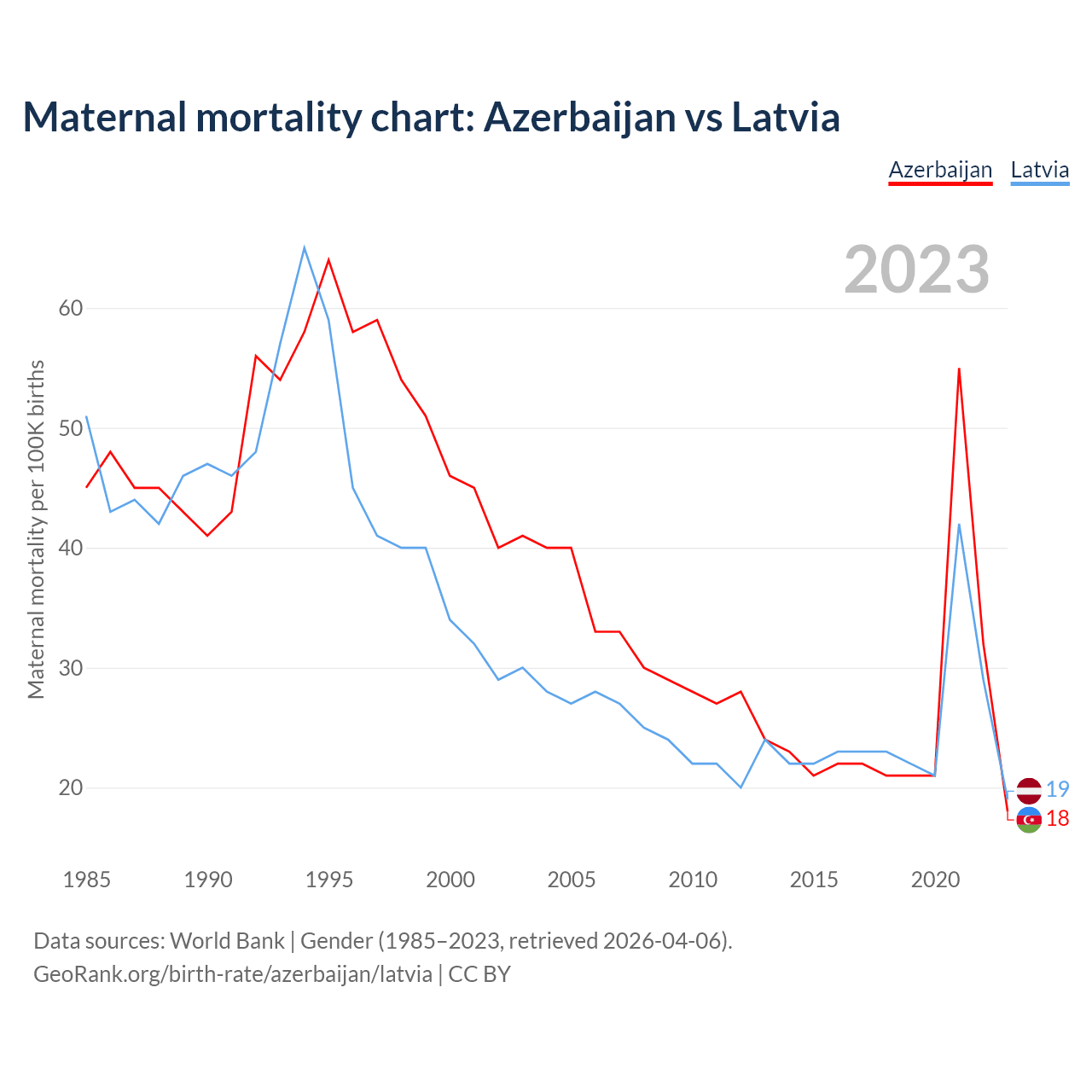 The maternal mortality rate, which is the probability of dying during childbirth or within 42 days of pregnancy termination, is 18 deaths per 100,000 live births in Azerbaijan, compared to 19 deaths in Latvia.