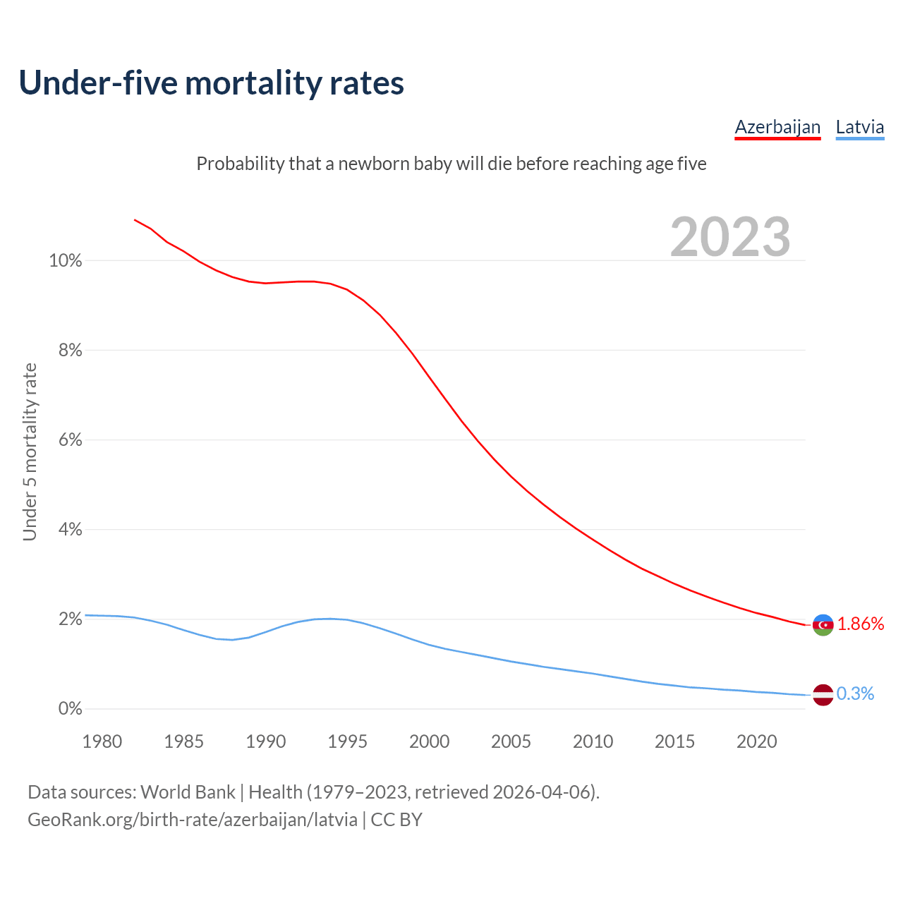 The chance that a newborn baby will die before reaching age five is 1.86% in Azerbaijan and 0.3% in Latvia. Above is a chart with historical data on under-five mortality rates.