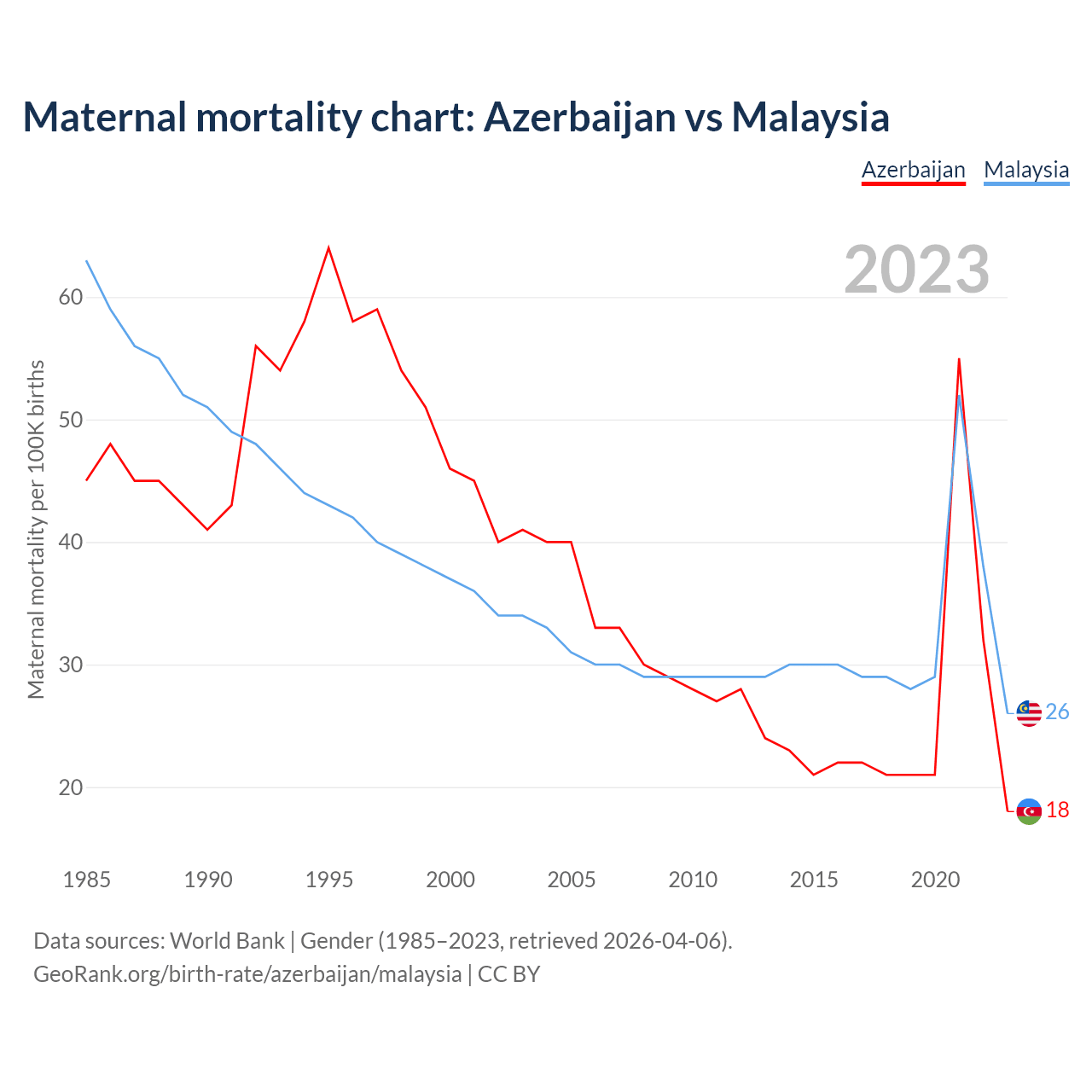 The maternal mortality rate, which is the probability of dying during childbirth or within 42 days of pregnancy termination, is 18 deaths per 100,000 live births in Azerbaijan, compared to 26 deaths in Malaysia.