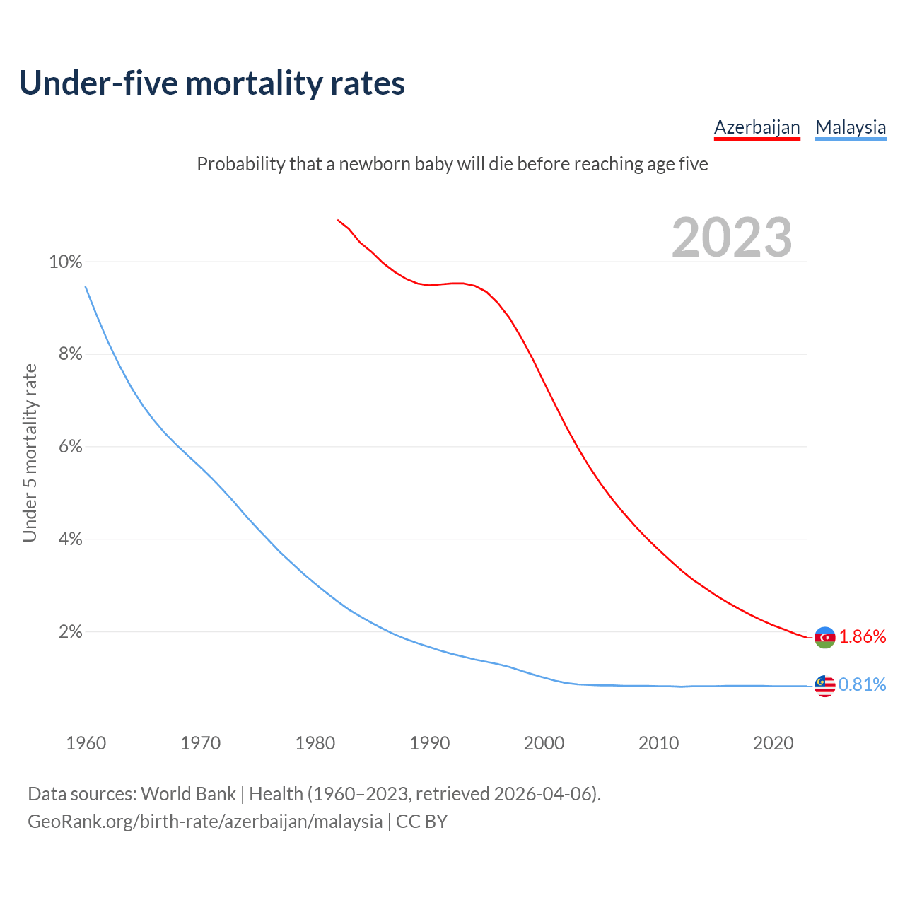 The chance that a newborn baby will die before reaching age five is 1.86% in Azerbaijan and 0.81% in Malaysia. Above is a chart with historical data on under-five mortality rates.