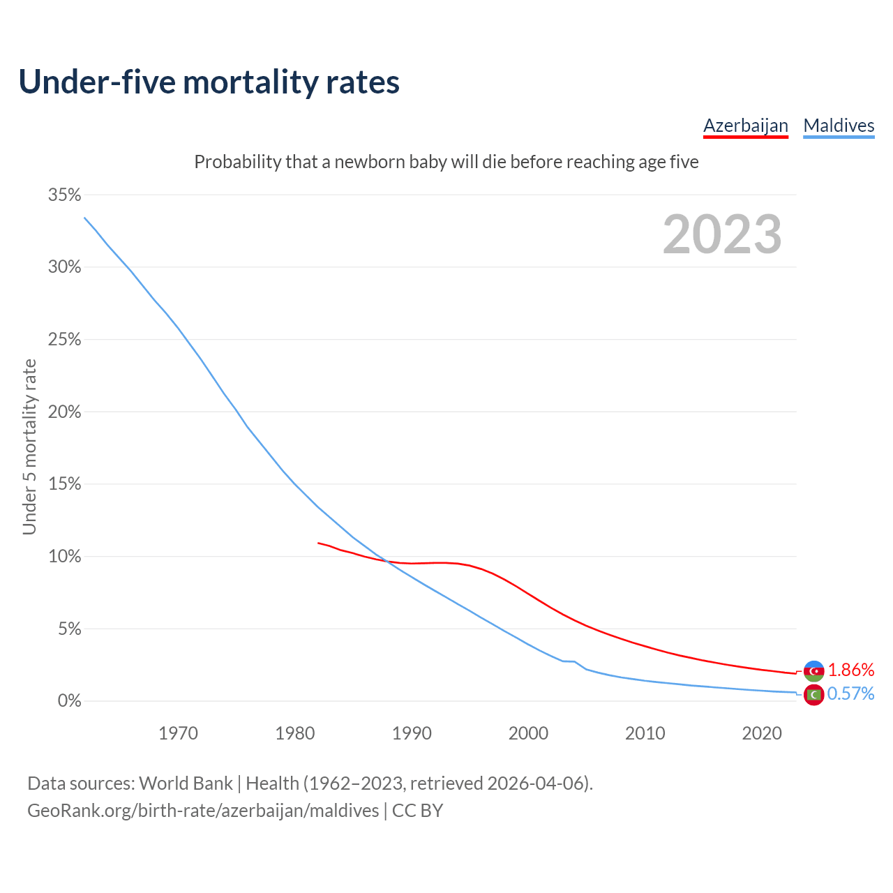 The chance that a newborn baby will die before reaching age five is 1.86% in Azerbaijan and 0.57% in Maldives. Above is a chart with historical data on under-five mortality rates.
