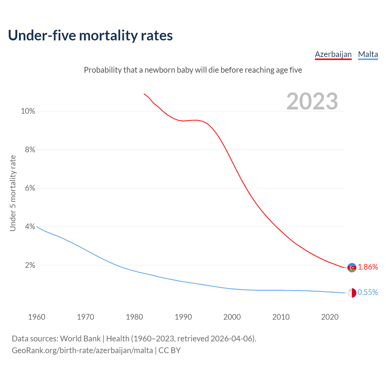 The chance that a newborn baby will die before reaching age five is 1.86% in Azerbaijan and 0.55% in Malta. Above is a chart with historical data on under-five mortality rates.