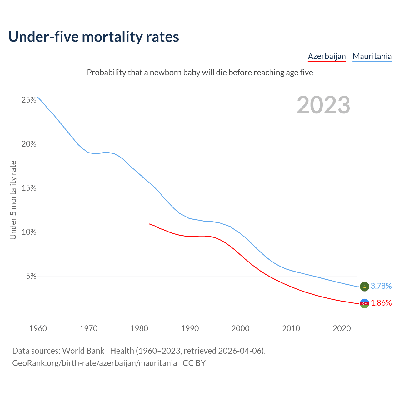 The chance that a newborn baby will die before reaching age five is 1.86% in Azerbaijan and 3.78% in Mauritania. Above is a chart with historical data on under-five mortality rates.
