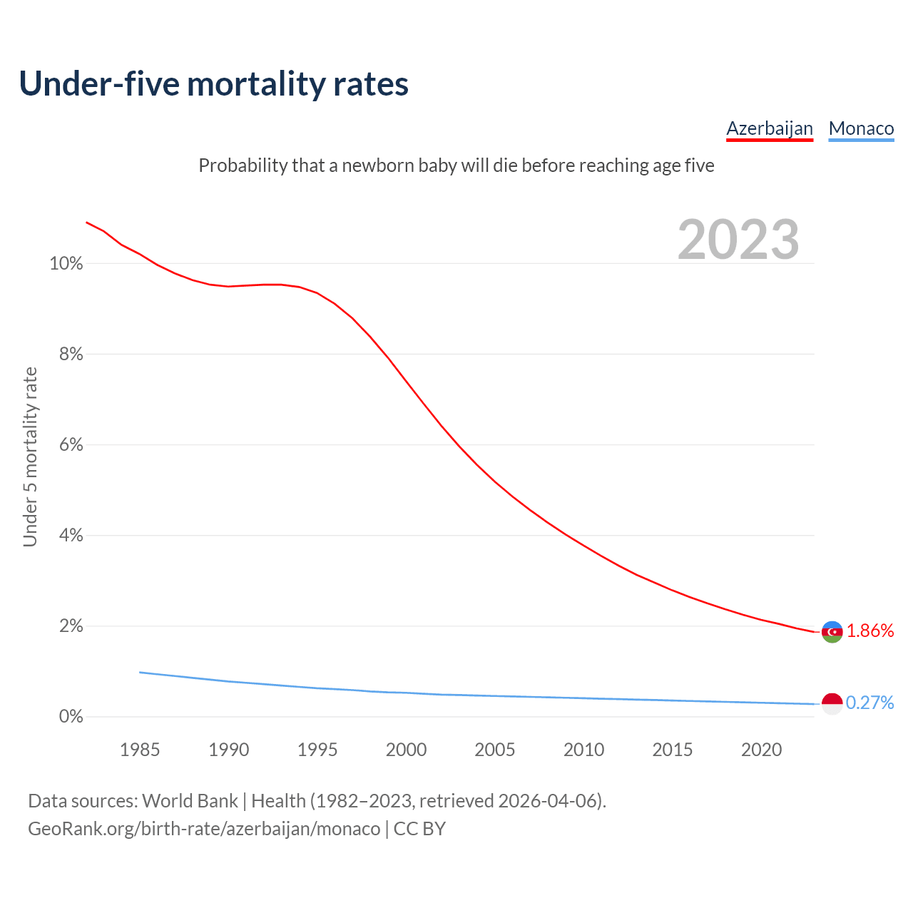 The chance that a newborn baby will die before reaching age five is 1.86% in Azerbaijan and 0.27% in Monaco. Above is a chart with historical data on under-five mortality rates.