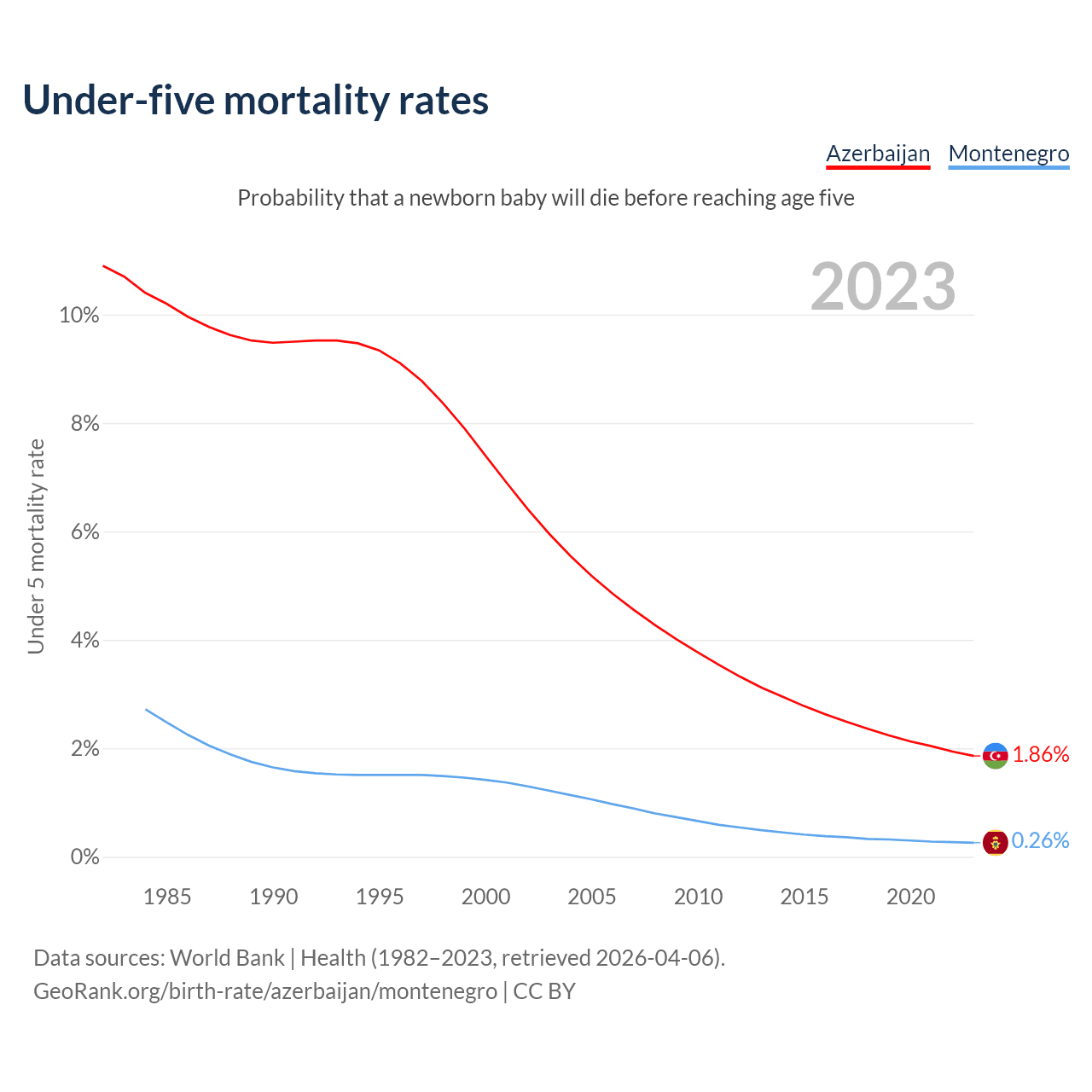 The chance that a newborn baby will die before reaching age five is 1.86% in Azerbaijan and 0.26% in Montenegro. Above is a chart with historical data on under-five mortality rates.