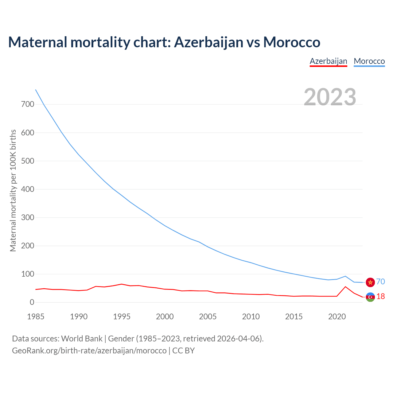 The maternal mortality rate, which is the probability of dying during childbirth or within 42 days of pregnancy termination, is 18 deaths per 100,000 live births in Azerbaijan, compared to 70 deaths in Morocco.