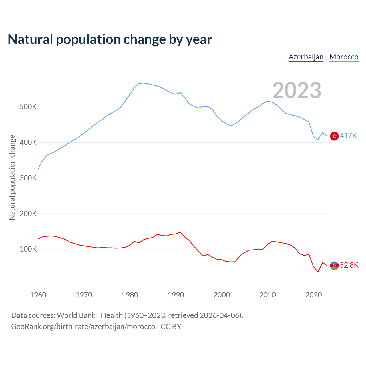 Azerbaijan has an annual birth rate of 11.1 births per 1,000 people, compared to 16.7 for Morocco. The average number of children a woman is expected to have during her lifetime — the fertility rate, is 1.55 in Azerbaijan and 2.23 in Morocco — 43.9% difference.
