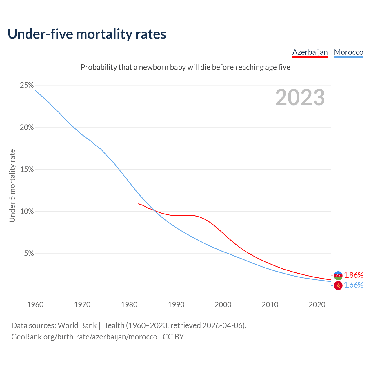 The chance that a newborn baby will die before reaching age five is 1.86% in Azerbaijan and 1.66% in Morocco. Above is a chart with historical data on under-five mortality rates.