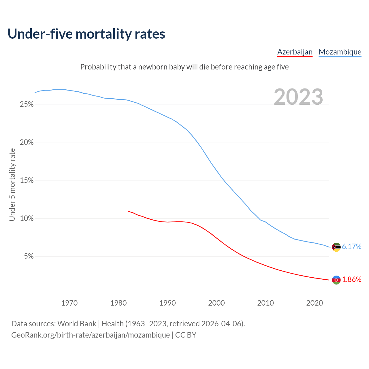 The chance that a newborn baby will die before reaching age five is 1.86% in Azerbaijan and 6.17% in Mozambique. Above is a chart with historical data on under-five mortality rates.