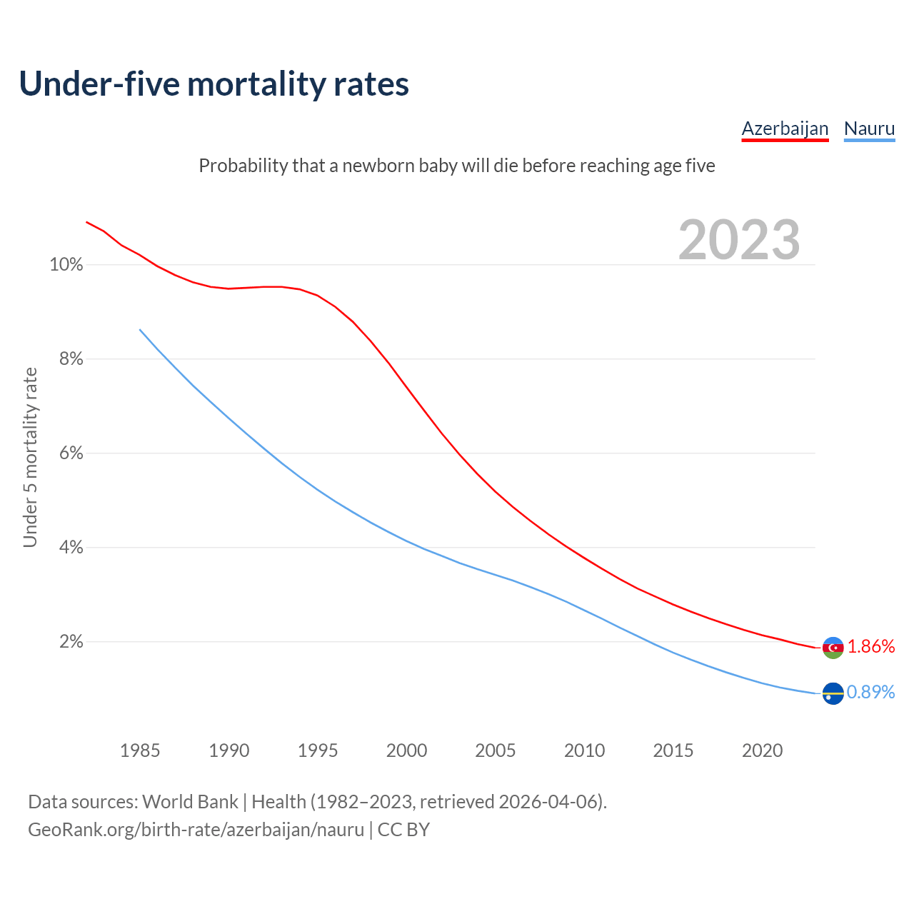 The chance that a newborn baby will die before reaching age five is 1.86% in Azerbaijan and 0.89% in Nauru. Above is a chart with historical data on under-five mortality rates.
