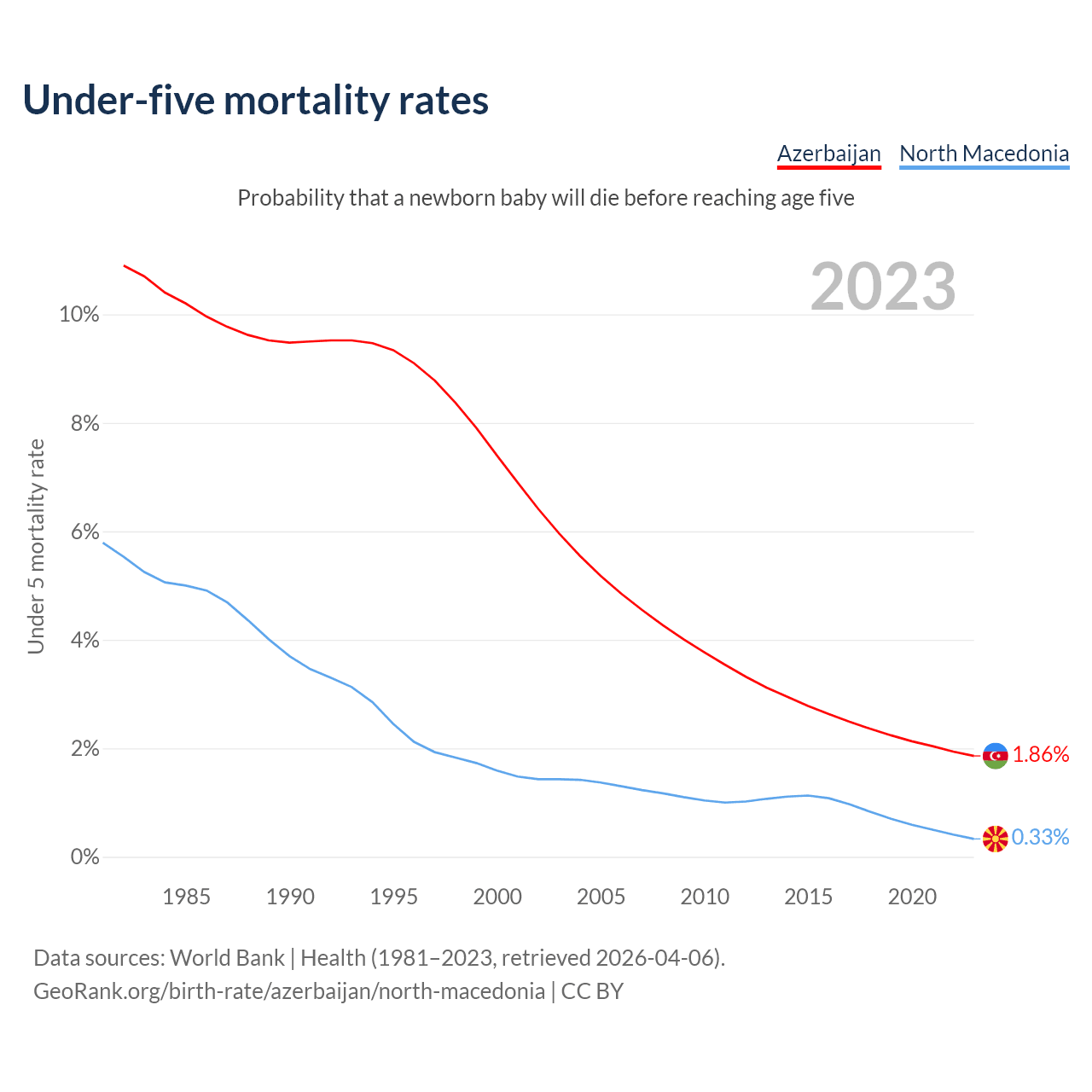The chance that a newborn baby will die before reaching age five is 1.86% in Azerbaijan and 0.33% in North Macedonia. Above is a chart with historical data on under-five mortality rates.