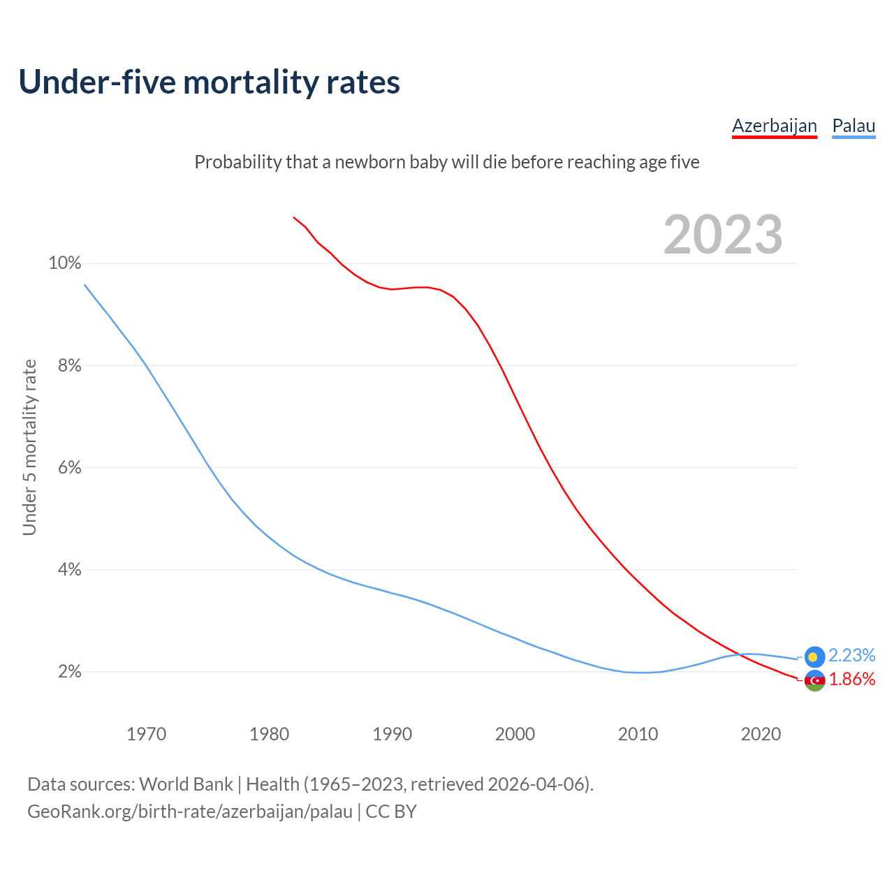 The chance that a newborn baby will die before reaching age five is 1.86% in Azerbaijan and 2.23% in Palau. Above is a chart with historical data on under-five mortality rates.