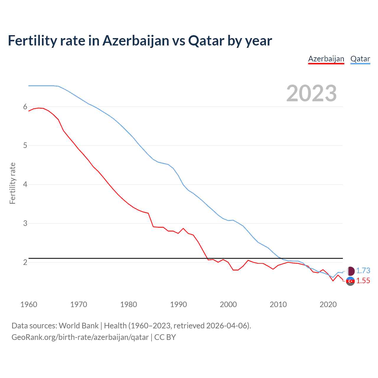 1960 vs 2023, the fertility rate has decreased by 73.6% in Azerbaijan and by 73.5% in Qatar — in 1960, it was 5.88 and 6.53, respectively.