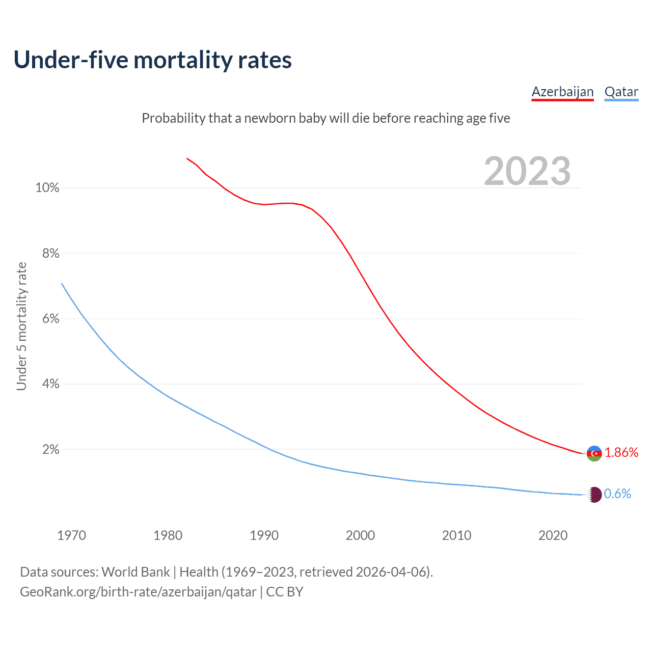 The chance that a newborn baby will die before reaching age five is 1.86% in Azerbaijan and 0.6% in Qatar. Above is a chart with historical data on under-five mortality rates.