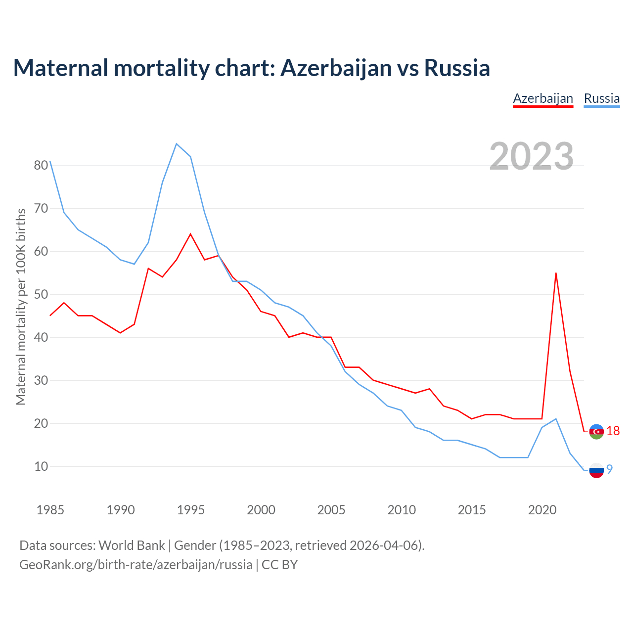 The maternal mortality rate, which is the probability of dying during childbirth or within 42 days of pregnancy termination, is 18 deaths per 100,000 live births in Azerbaijan, compared to 9 deaths in Russia.
