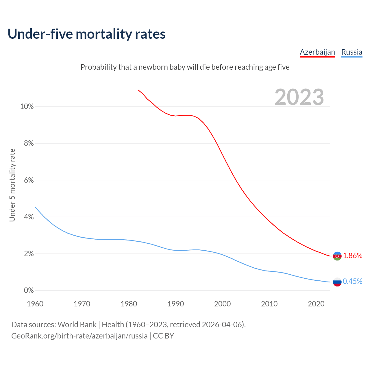The chance that a newborn baby will die before reaching age five is 1.86% in Azerbaijan and 0.45% in Russia. Above is a chart with historical data on under-five mortality rates.