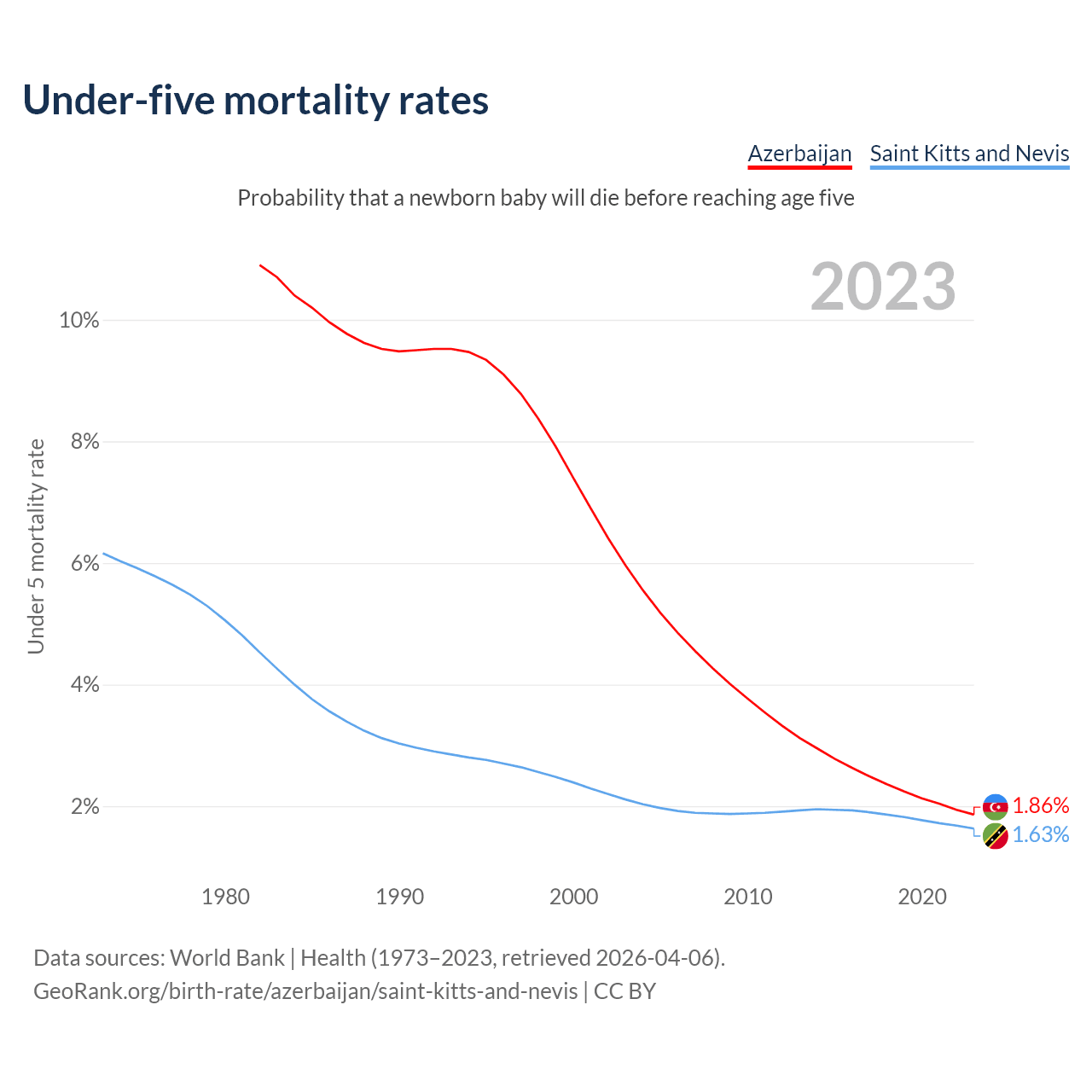 The chance that a newborn baby will die before reaching age five is 1.86% in Azerbaijan and 1.63% in Saint Kitts and Nevis. Above is a chart with historical data on under-five mortality rates.