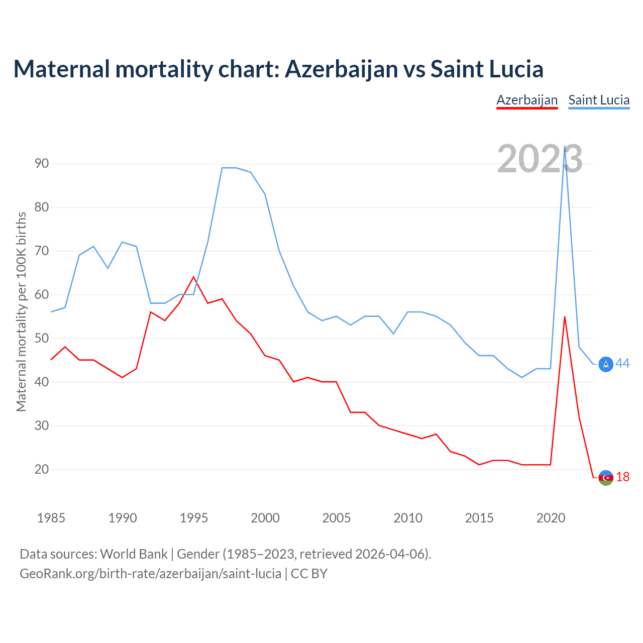 The maternal mortality rate, which is the probability of dying during childbirth or within 42 days of pregnancy termination, is 18 deaths per 100,000 live births in Azerbaijan, compared to 44 deaths in Saint Lucia.