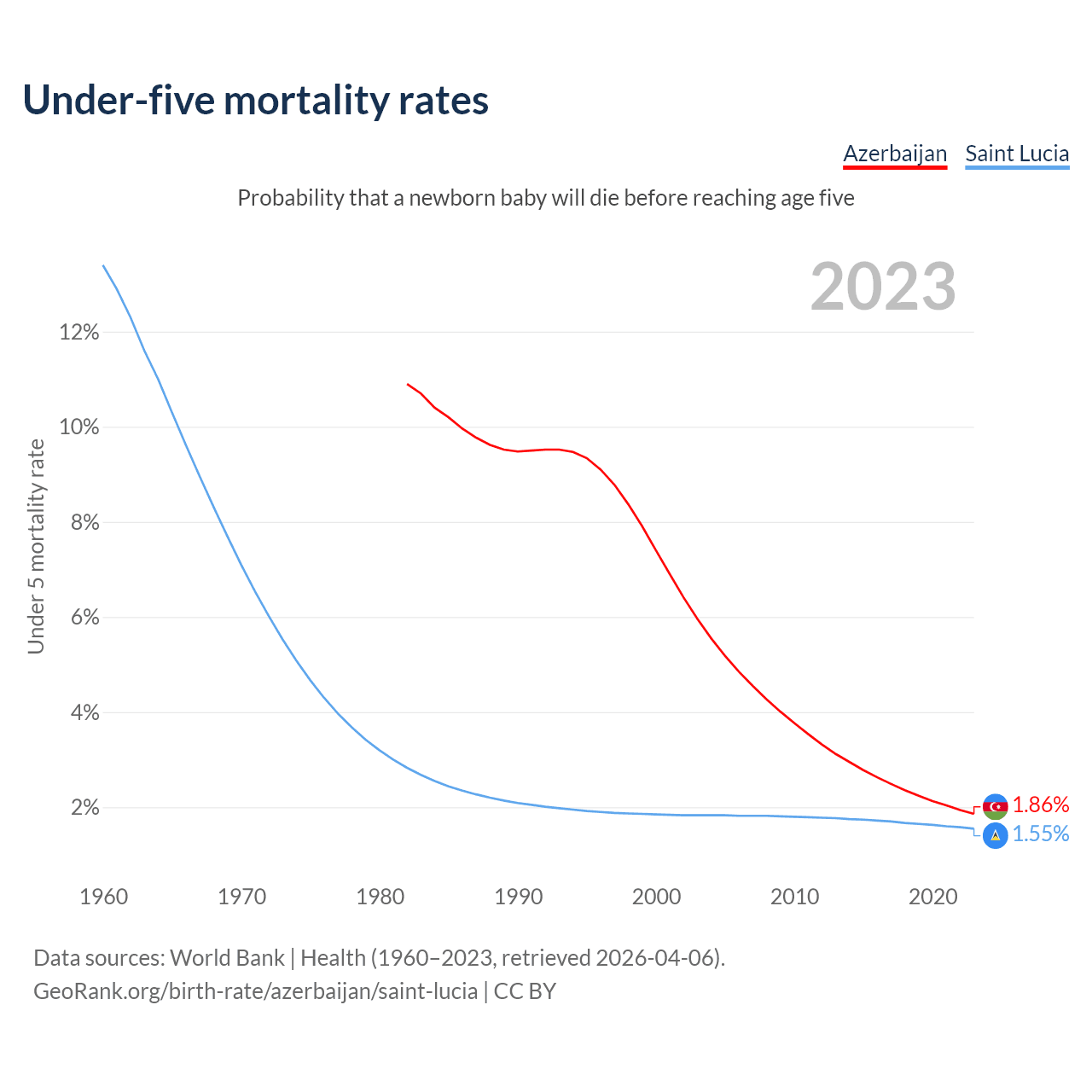 The chance that a newborn baby will die before reaching age five is 1.86% in Azerbaijan and 1.55% in Saint Lucia. Above is a chart with historical data on under-five mortality rates.