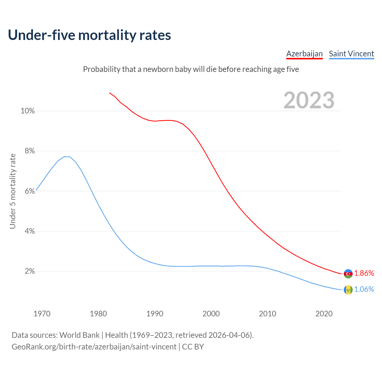 The chance that a newborn baby will die before reaching age five is 1.86% in Azerbaijan and 1.06% in Saint Vincent. Above is a chart with historical data on under-five mortality rates.