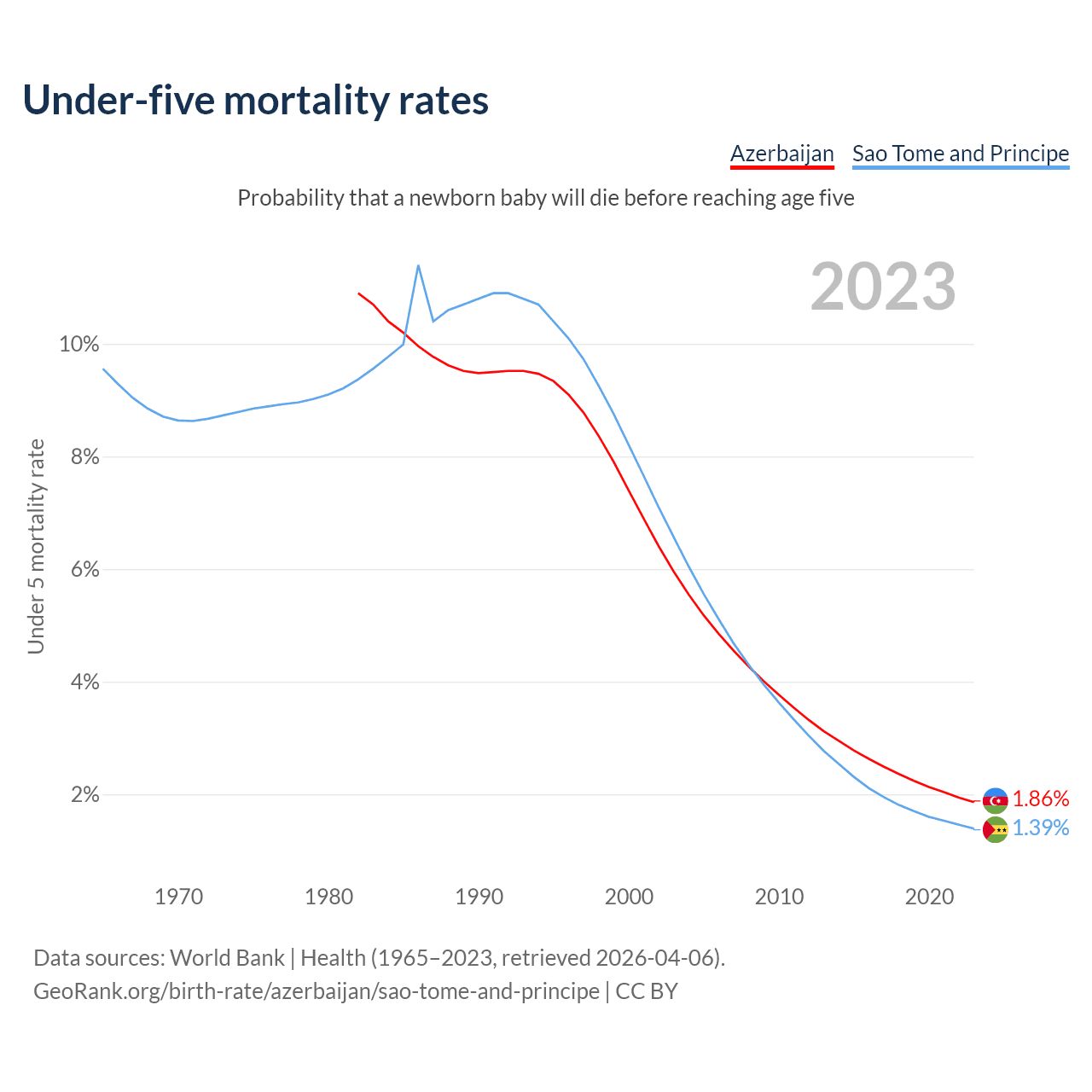 The chance that a newborn baby will die before reaching age five is 1.86% in Azerbaijan and 1.39% in Sao Tome and Principe. Above is a chart with historical data on under-five mortality rates.
