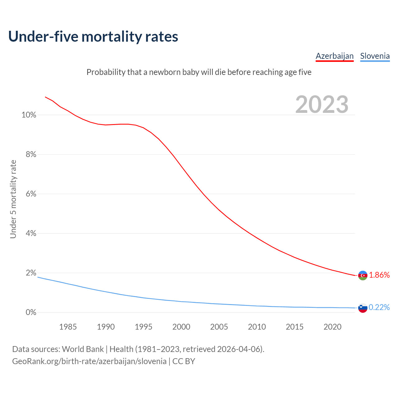 The chance that a newborn baby will die before reaching age five is 1.86% in Azerbaijan and 0.22% in Slovenia. Above is a chart with historical data on under-five mortality rates.