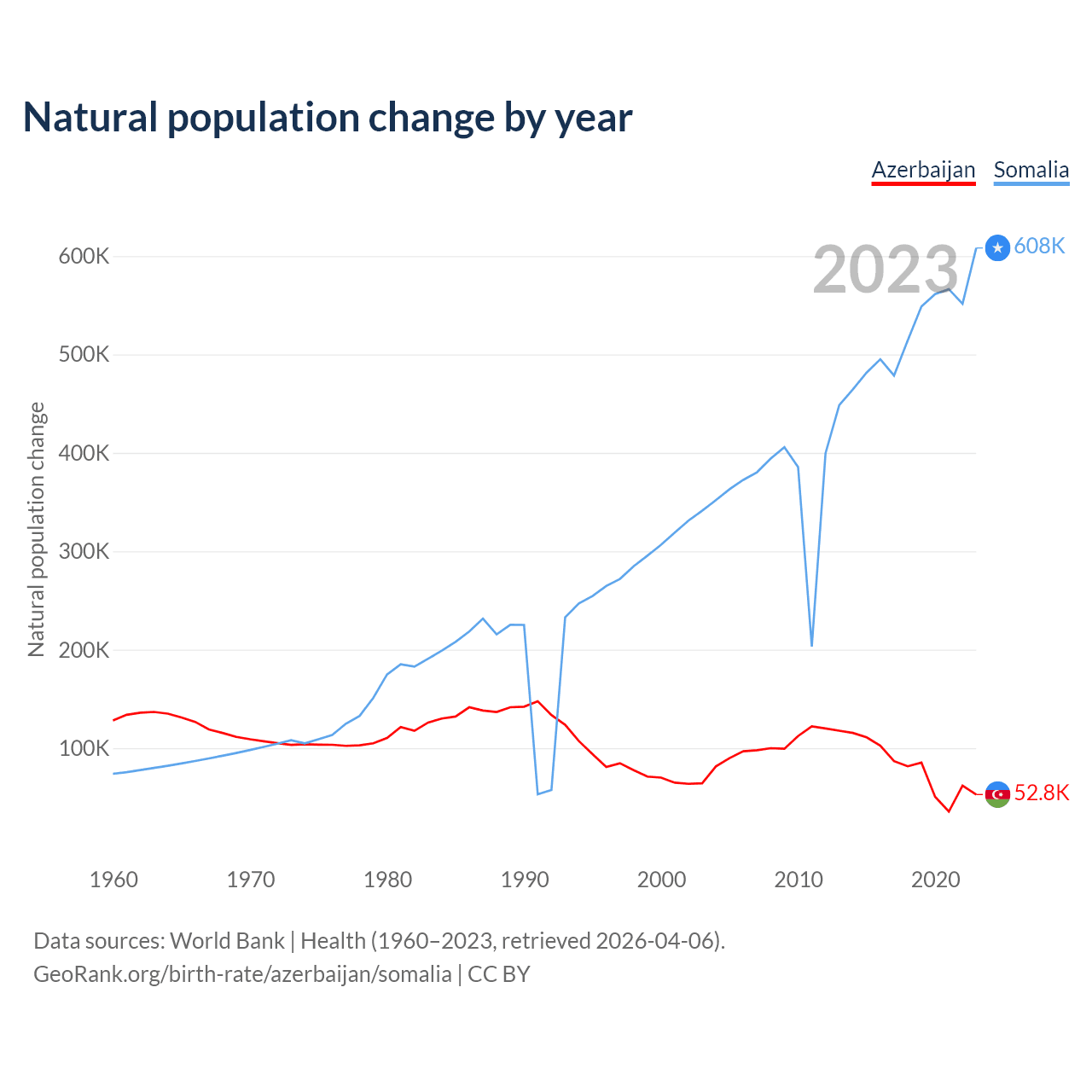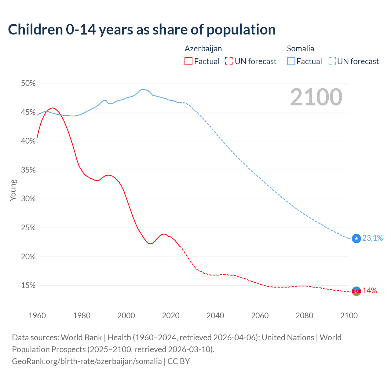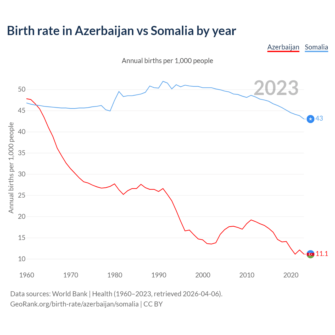 Azerbaijan has an annual birth rate of 11.1 births per 1,000 people, compared to 43 for Somalia. The average number of children a woman is expected to have during her lifetime — the fertility rate, is 1.55 in Azerbaijan and 6.13 in Somalia — 295.6% difference.