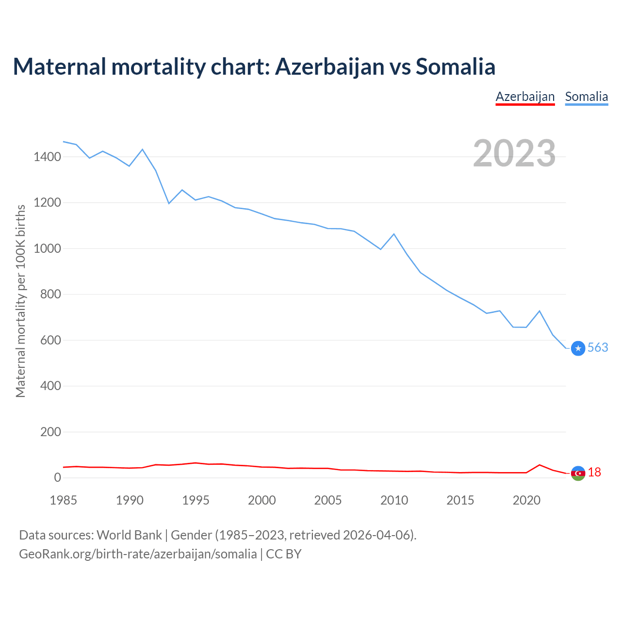 The maternal mortality rate, which is the probability of dying during childbirth or within 42 days of pregnancy termination, is 18 deaths per 100,000 live births in Azerbaijan, compared to 563 deaths in Somalia.
