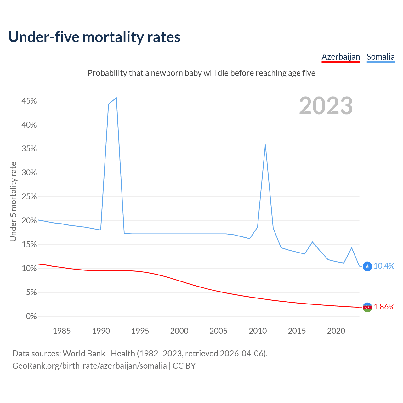 The chance that a newborn baby will die before reaching age five is 1.86% in Azerbaijan and 10.4% in Somalia. Above is a chart with historical data on under-five mortality rates.