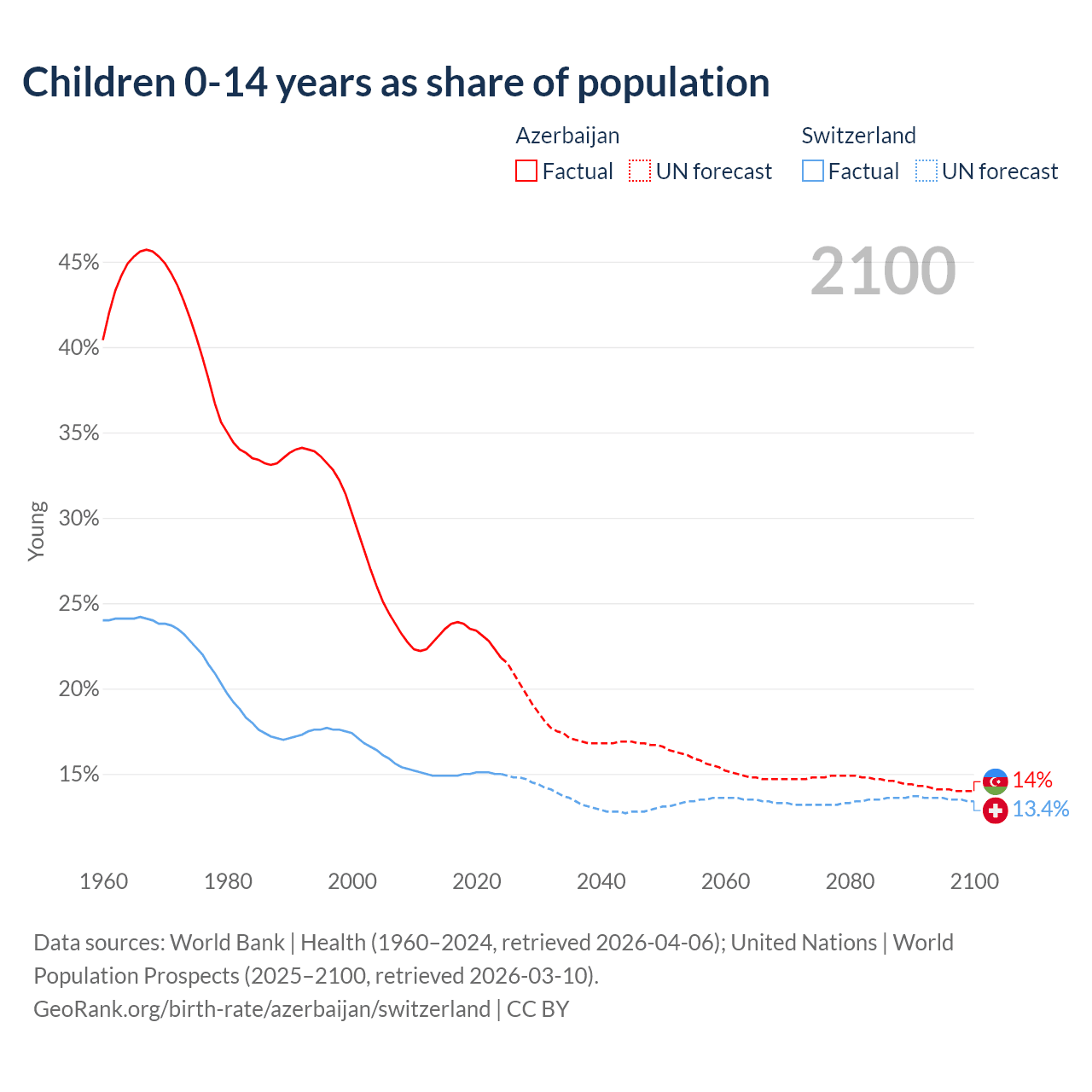 Azerbaijan has an annual birth rate of 11.1 births per 1,000 people, compared to 9 for Switzerland. The average number of children a woman is expected to have during her lifetime — the fertility rate, is 1.55 in Azerbaijan and 1.33 in Switzerland — 14.2% difference.
