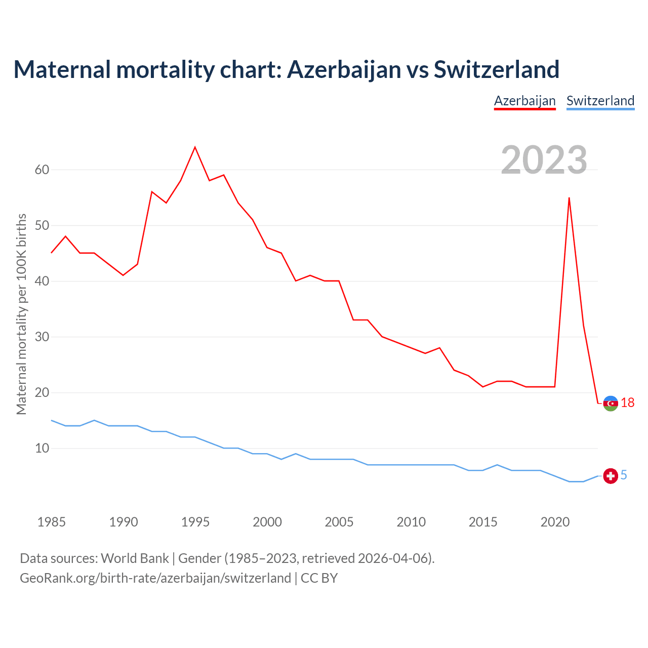 The maternal mortality rate, which is the probability of dying during childbirth or within 42 days of pregnancy termination, is 18 deaths per 100,000 live births in Azerbaijan, compared to 5 deaths in Switzerland.