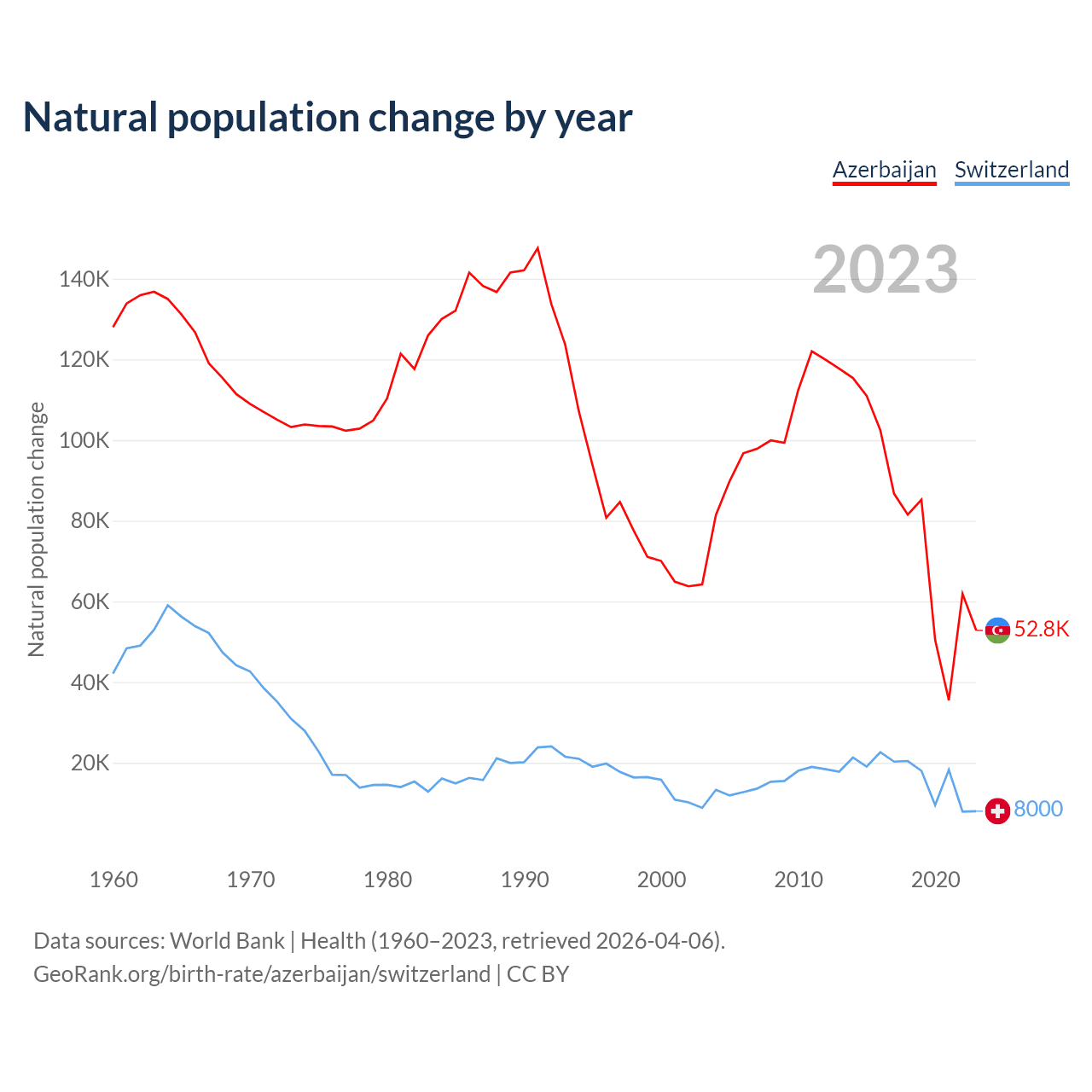 According to the latest available data on birth rates, the fertility rate in Azerbaijan was 1.55 children per woman in 2023, compared to 1.33 in Switzerland in 2023. The replacement level is considered to be 2.1 children per woman.