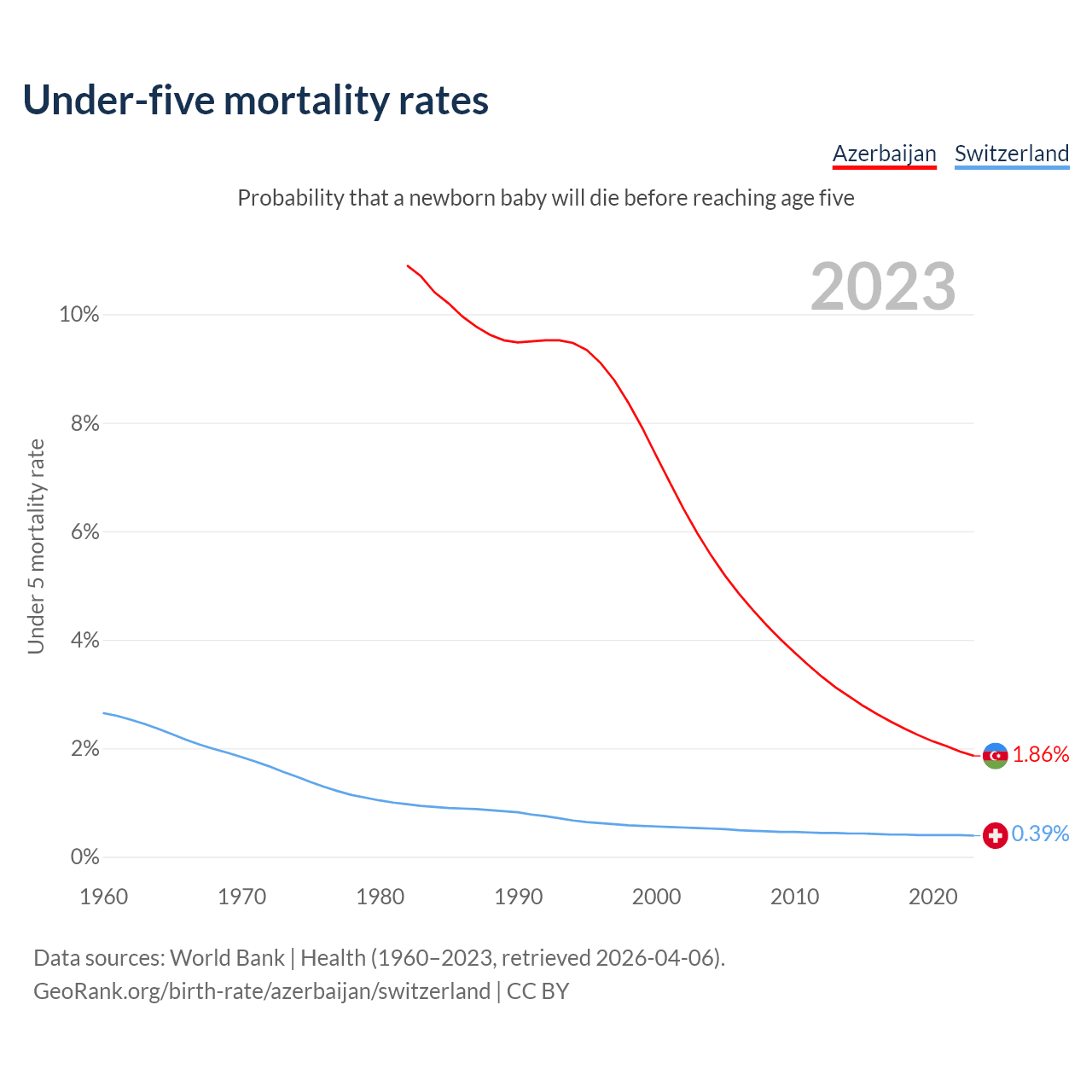 The chance that a newborn baby will die before reaching age five is 1.86% in Azerbaijan and 0.39% in Switzerland. Above is a chart with historical data on under-five mortality rates.