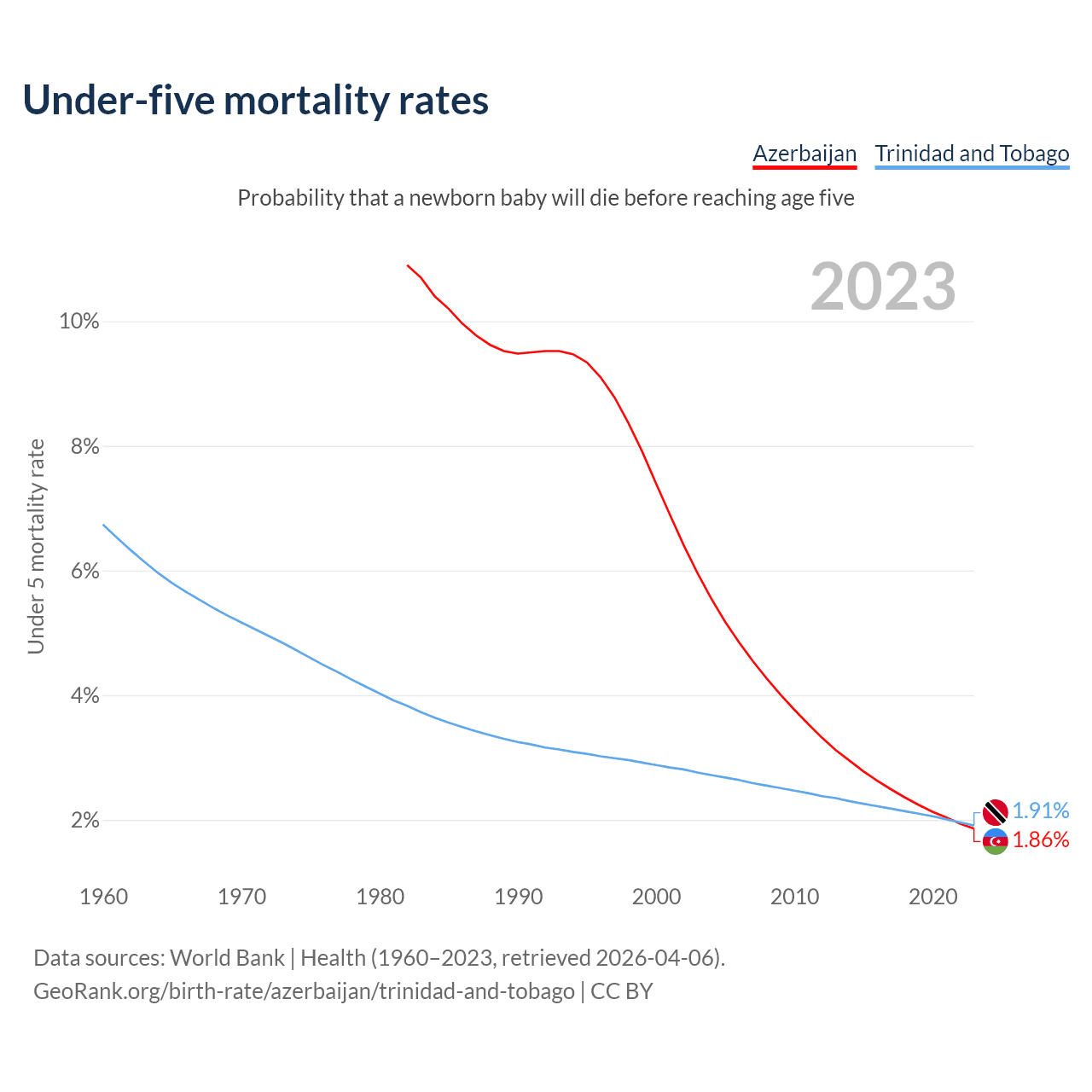 The chance that a newborn baby will die before reaching age five is 1.86% in Azerbaijan and 1.91% in Trinidad and Tobago. Above is a chart with historical data on under-five mortality rates.