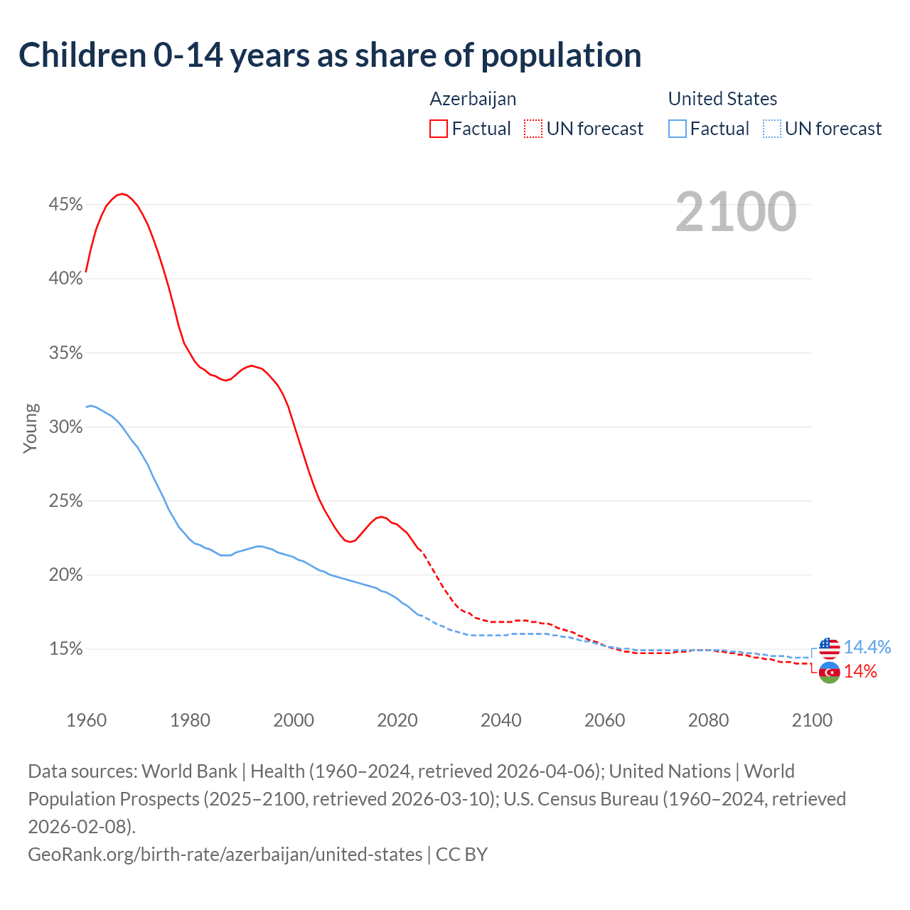 According to the latest available data on birth rates, the fertility rate in Azerbaijan was 1.55 children per woman in 2023, compared to 1.62 in the United States in 2023. The replacement level is considered to be 2.1 children per woman.