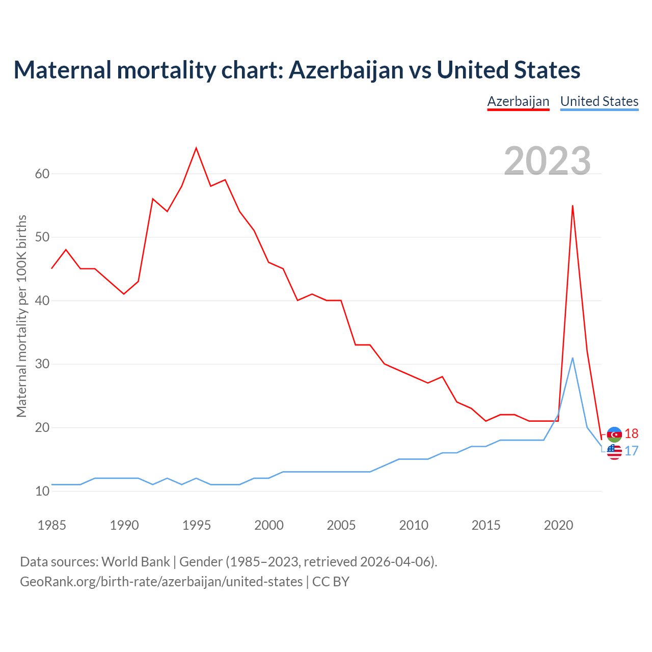 The maternal mortality rate, which is the probability of dying during childbirth or within 42 days of pregnancy termination, is 18 deaths per 100,000 live births in Azerbaijan, compared to 17 deaths in the United States.