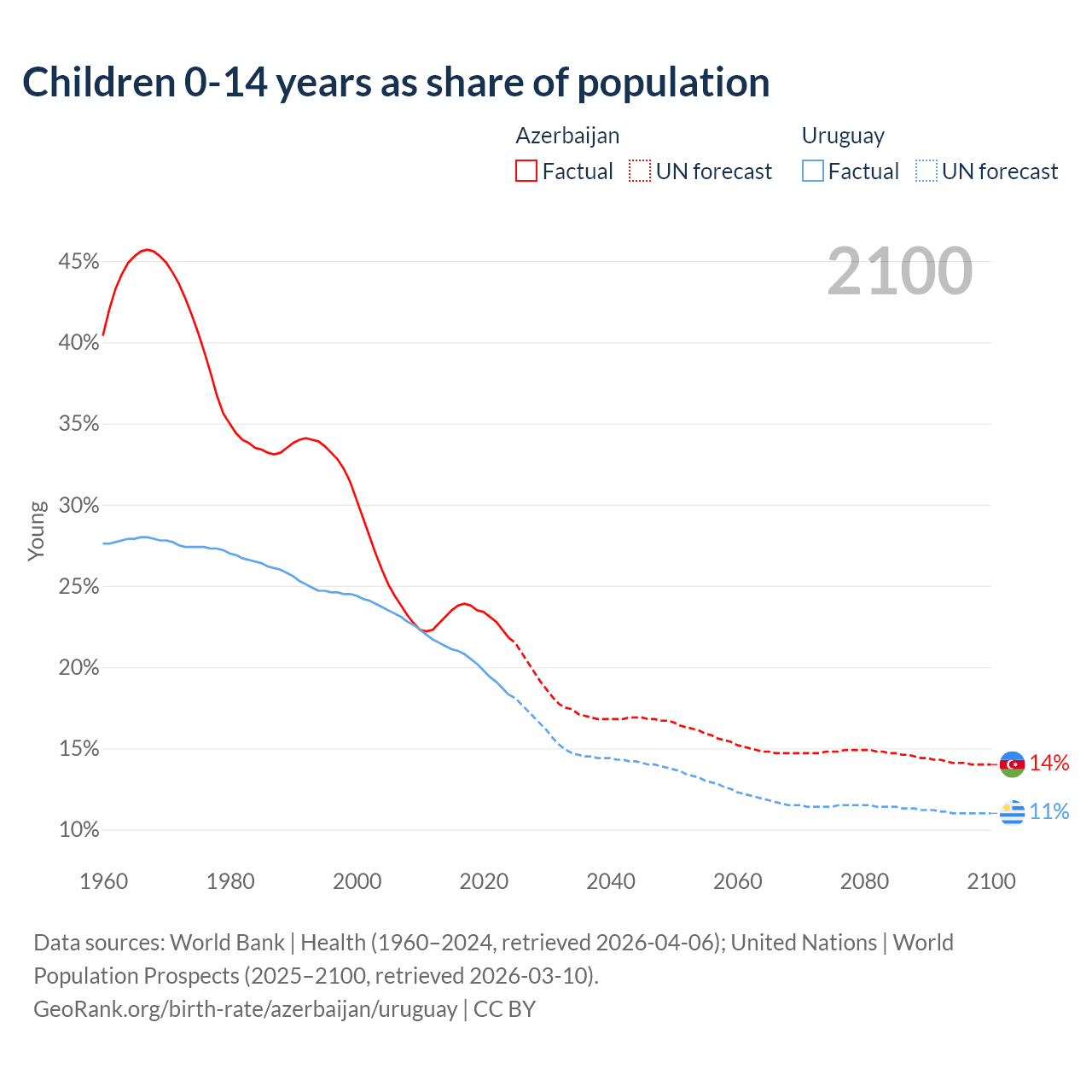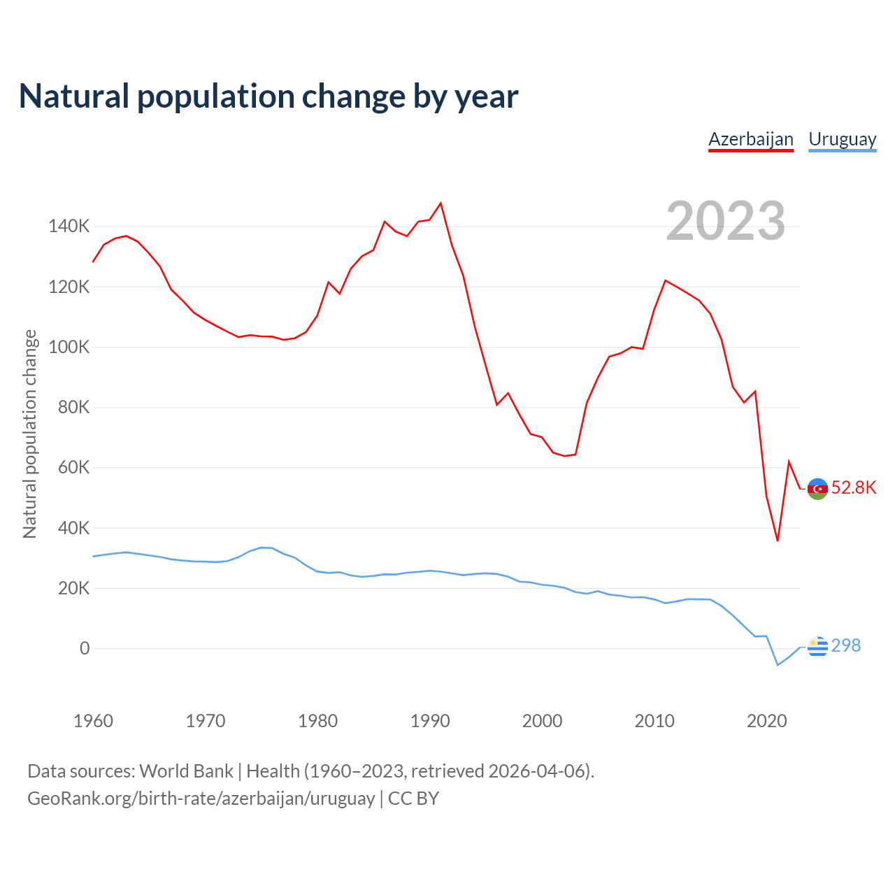 Azerbaijan has an annual birth rate of 11.1 births per 1,000 people, compared to 9.87 for Uruguay. The average number of children a woman is expected to have during her lifetime — the fertility rate, is 1.55 in Azerbaijan and 1.41 in Uruguay — 9.1% difference.