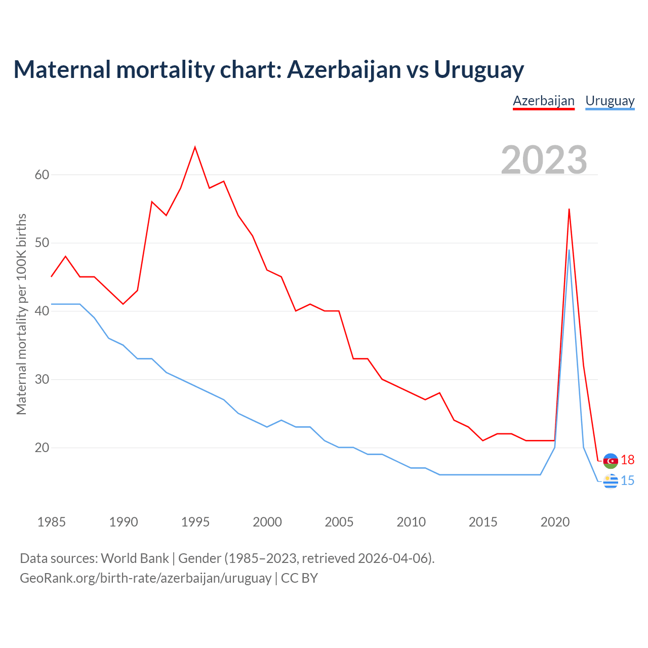 The maternal mortality rate, which is the probability of dying during childbirth or within 42 days of pregnancy termination, is 18 deaths per 100,000 live births in Azerbaijan, compared to 15 deaths in Uruguay.
